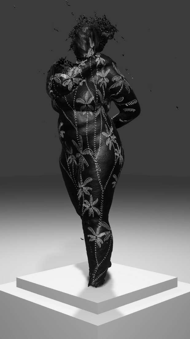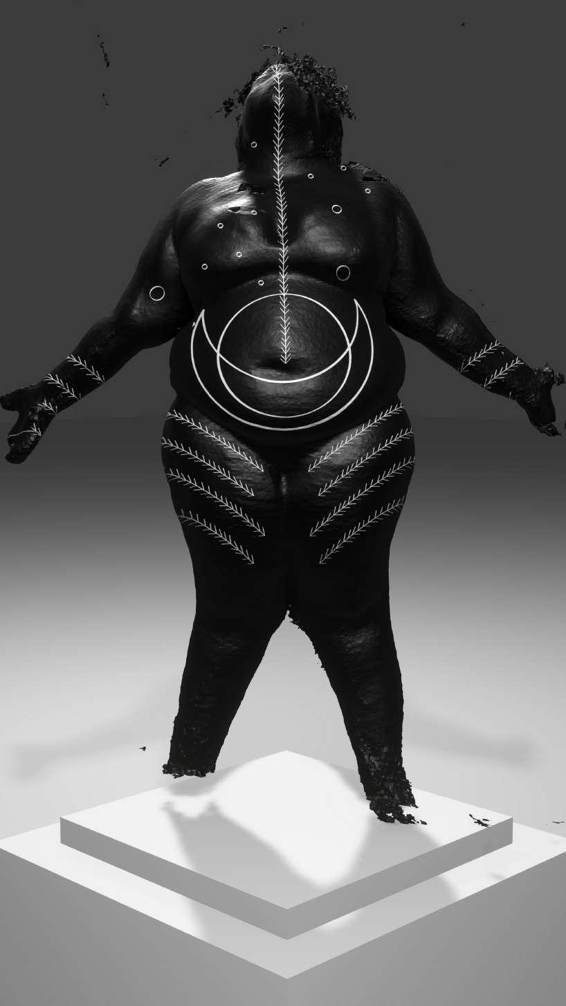 “kiburi” (2021-) is a multimedia body of work that explores the design and thematic characteristics of pre-colonial East African indigenous tattoo practices, combining contemporary Swahili coast-inspired symbols with aesthetic drawing techniques inspired by the Makonde and the Barabaig tribes A diverse set of 3D scanned bodies, known as “echoes” in current and past works by the artist, are used as canvases for the new designs, and are presented on pedestals reminiscent of fine-art sculptures These digital works are then presented on large fine art prints, partially painted by the artists to evoke a sense of relief – scars left behind through the invasive art of tattooing While the printed pieces are 2D, Augmented Reality is incorporated to allow the audience to experience the way the artwork wraps around the entire digital body.
