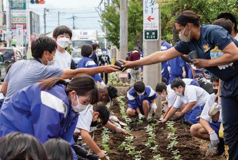 Capt. J M Montagnet, Naval Air Facility (NAF) Atsugi commanding officer, and Command Master Chief Weba Roberts, work together with Zama-Minami Junior High School student volunteers and Sailors to plant flowers during a community relations event. Sixteen Sailors joined 80 7th grade students to complete the annual beautification project. (U.S. Navy photos by MC2 Ange Olivier Clement)