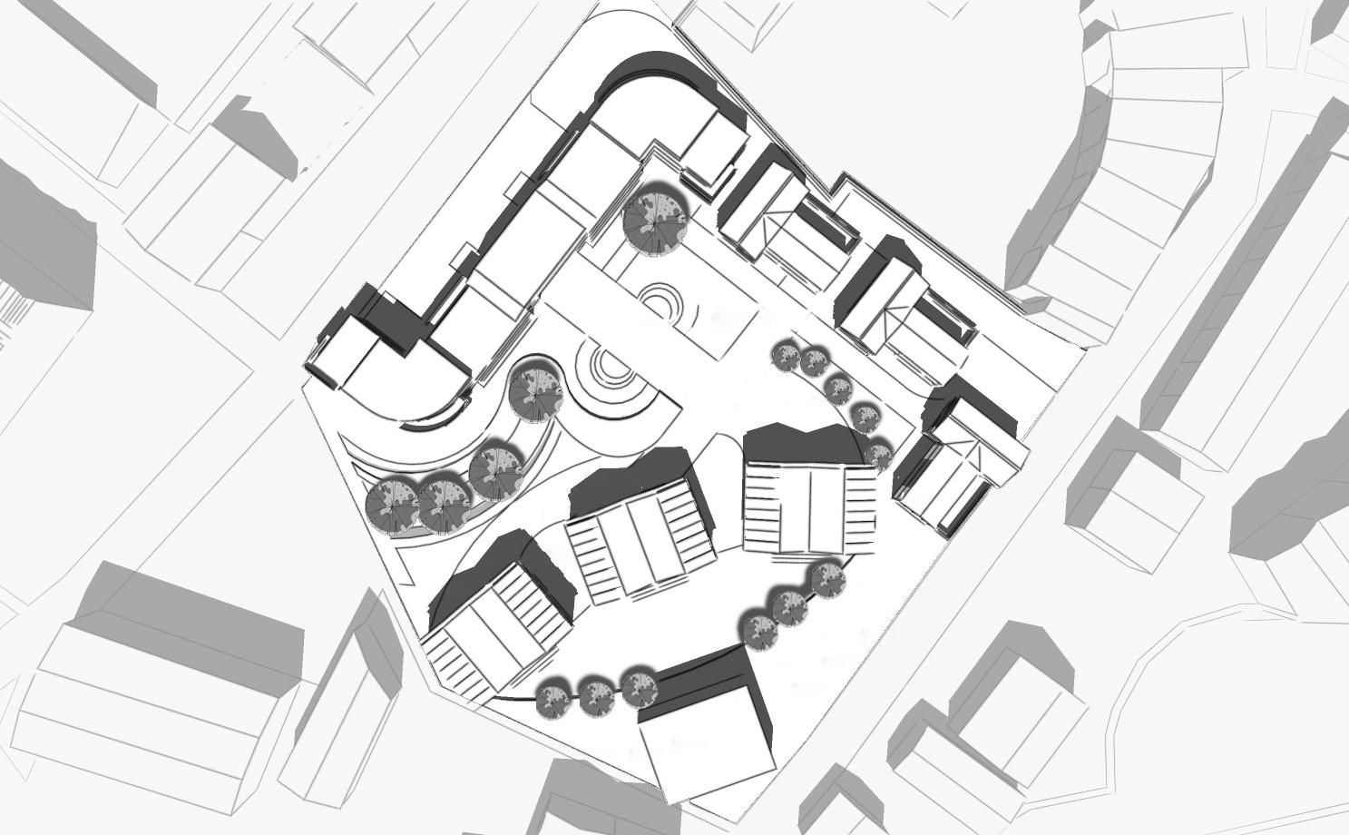 The linear pattern of dwellings with constrasting densities and forms within the two streets gives the development character. The mono-pitched roofs of the three-story townhouses introduce a dynamic street profile; the varying heights of the dwelling also add to this.