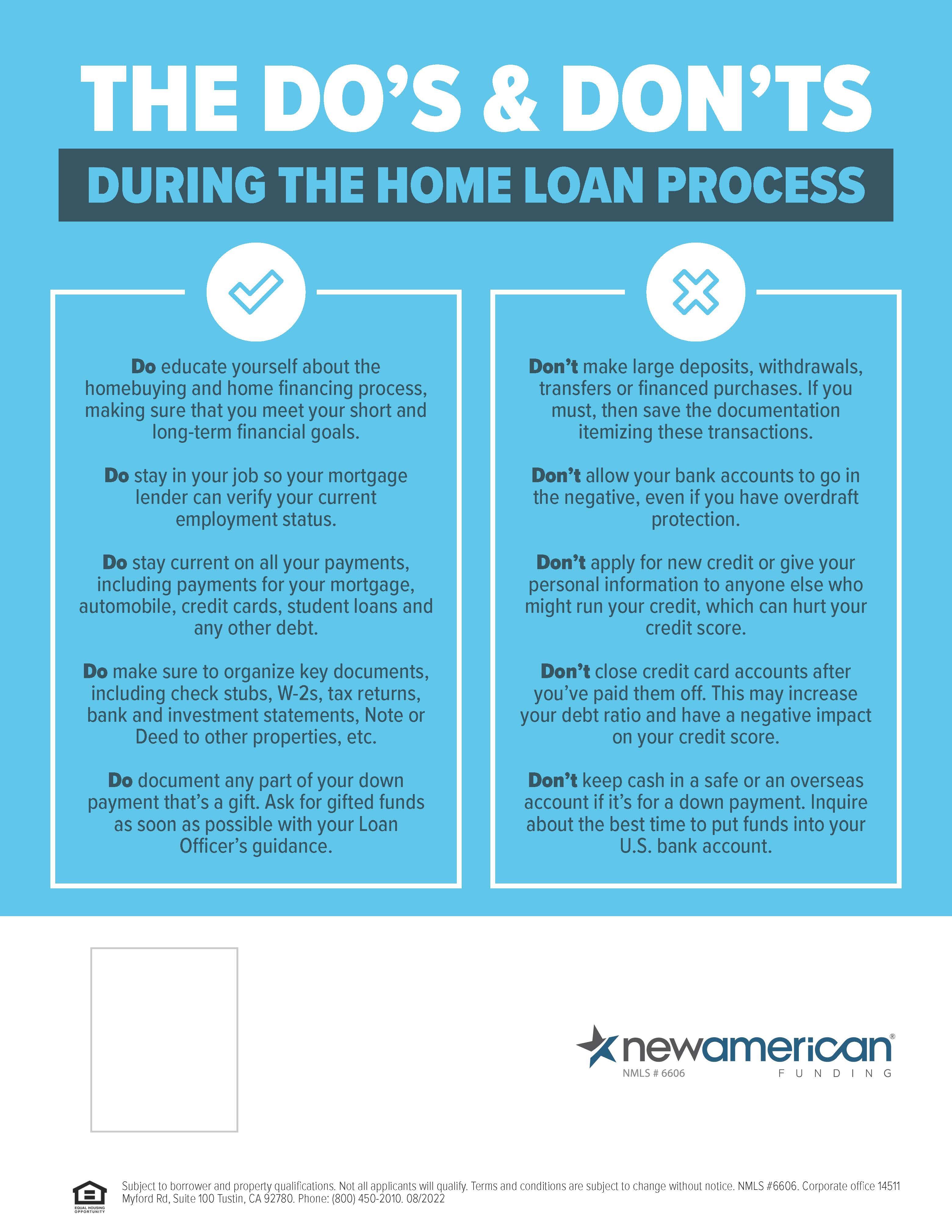 Don’t make any financial changes that would impact your loan Switching jobs, getting a new car, making big purchases on credit, cosigning for a loan - these are some common yet avoidable mistakes that may stop you from closing your loan and buying your dream house Hold off on big changes (Yes, lenders will do a credit refresh and employment verification right before closing to ensure that nothing has changed since your pre-approval or your conditional approval) So, sit tight, close on your loan, and enjoy your new home!
