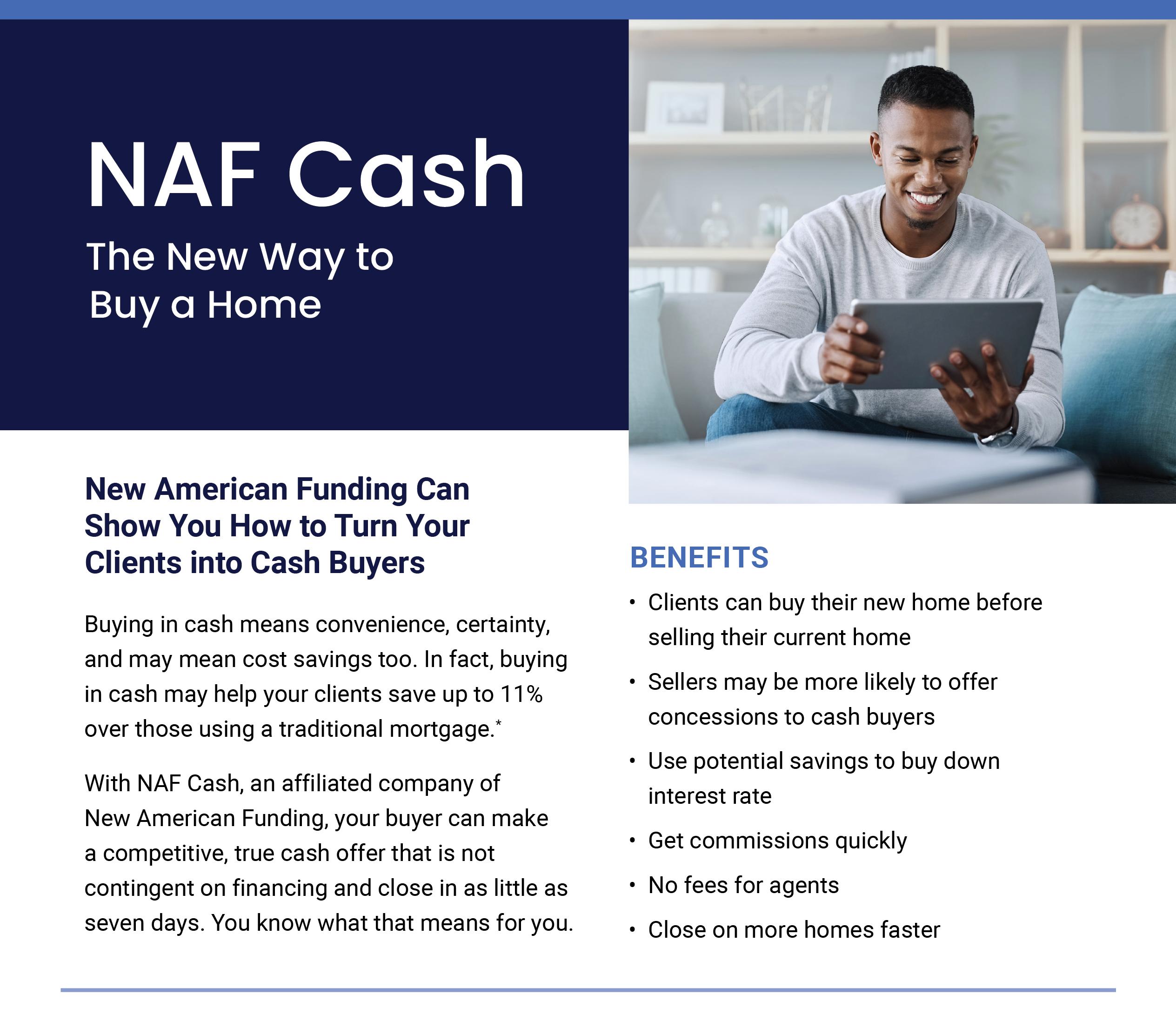 Buying in cash means convenience, certainty and could mean a cost saving too. With NAF Cash, an affiliated company of New American Funding, you can make a competitive, true cash offer that is not contingent on financing and close in as little as seven days without having to sell your current home first.