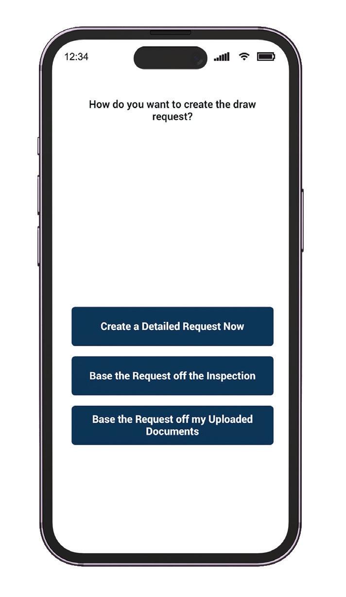 To start a new payment request, select the Request Payment button in the upper right-hand corner of the screen. A pop-up to select the Draw Type (Fig. 1) will open; select the draw to the request.