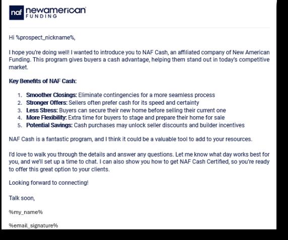 Targetnewpartnershipsfromthestartwitha35-Day,6touchpoint emailcampaignthatdeliversinsightsintoNAF’sjointvalueproposition andexclusivebenefitsofworkingwithYOUsoyoucanunlockthefull potentialofcollaboration.