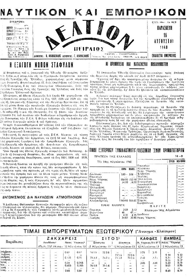 211 H ΙΣΤΟΡΙΑ με την ισχυρή παρουσία προσφύγων. Η Ελλάδα προσπαθεί να ανασυγκροτηθεί. Η Μεγάλη Ιδέα αλλάζει μορφή από εδαφική σε αναπτυξιακή. Χρειάζεται εξειδικευμένη ενημέρωση για τους παραγωγικούς φορείς. Στις 8 Μαρτίου 1924 κυκλοφορεί το πρώτο δαχτυλογραφημένο φύλλο με τίτλο «ΝΑΥΤΙΚΟΝ ΚΑΙ ΕΜΠΟΡΙΚΟΝ ΔΕΛΤΙΟΝ ΠΕΙΡΑΙΩΣ», που πήρε στις 2 Αυγούστου 1948 το όνομα «Η ΝΑΥΤΕΜΠΟΡΙΚΗ». Με κατάπλους και απόπλους. Όνομα πλοίου, σημαία, ιδιοκτήτης/πράκτορας του πλοίου, προέλευση/προορισμός, φορτίο σε τόνους. Με εξαγωγές. Ποσόν, είδος εμπορεύματος, προορισμός, ατμόπλοιον, φορτωτής, όπου και διακρίνουμε εμβληματικές εμπορικές επωνυμίες, Μεταξάς, Καμπάς, Μπαρμπαρέσος, Παπαστράτος. Κονιάκ εις φιάλας και καπνός εις φύλλα σε λιμάνια ξένα. Με εισαγωγές από αυτοκίνητα λελυμένα, φάρμακα, σιδηρικά και δέρματα μέχρι όρυζα, βακαλάο, φασόλια, ροβύθια, κρόμμυα και πίτυρα. Οι αλλαγές γίνονται χειρόγραφα στο φύλλο, που ο ίδιος ο Πάνος Αθανασιάδης διανέμει στα ναυτιλιακά και εμπορικά γραφεία. «Η αρχαιοτέρα εξ όλων των εκδοθεισών εις το είδος της εις ολόκληρον τον κόσμο, οικονομική, εμπορική, βιομηχανική και Στις 8 Μαρτίου 1924 κυκλοφορεί το πρώτο δαχτυλογραφημένο φύλλο με τίτλο «ΝΑΥΤΙΚΟΝ ΚΑΙ ΕΜΠΟΡΙΚΟΝ ΔΕΛΤΙΟΝ ΠΕΙΡΑΙΩΣ»