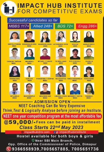 Nagaland Board of School Education (NBSE) has directed higher secondary institutions in the State to introduce more subjects as offered under the scheme of studies of the board. In a notification, NBSE insisted that an institution should have enough subjects to offer so that a student could select the subject of his/her choice to study as per the National Education Policy-- NEP, 2020 (4.9). The board also cautioned the institutions not to fix (Cont’d on p-8)