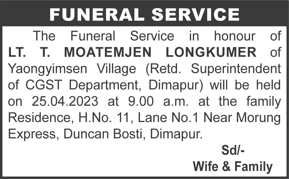 WSYF meeting: Western Sumi Youth Front has convened a meeting on April 26, at 11 am, at WSH office Chekiye village, to discuss for the upcoming general conference to be held on June. All office bearers and executive members have been informed to attend the meeting without fail, as no complaint will be entertained later.