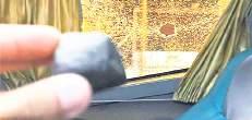 A smashed window of the team bus.