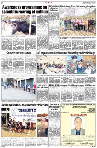 pur Government College (SSUDGC) has expressed grief and pain over the demise of ‘Lt. Colonel’ NNC/FGN late Nitoi Kiba of Zhekishe village on February 10. In a condolence message, Sumi Students’ Union Dimapur Government College said the patriotic life and dedicated service of late Nitoi Kiba for the Naga nation was memorable and would always be cherished and written in the history of Nagas. SSUDGC fur ther conveyed its condolence (L-R): Villagers availing treatment during medical camps organised by 35 Assam Rifles and 36 Assam Rifles. to the bereaved family. DIMAPUR: 35 Assam attended by residents from 240 patients and distrib- Peren. NAs and two female assisRifles under the aegis of 7-8 villages. uted free medicines. The medical camp tant. A total of 121 locals HQ IGAR (North) con- In the camp, Capt Tejesh 36 AR: On February was led team of Assam of the Pedi and neighborducted medical camp at B S, medical officer and 25, troops of 36 Assam Rifles medical staff con- ing villages attended the Wakching village, Mon paramedical medical staff Rifles conducted a medi- sisting of one Doctor, one camp and free medicines on February 24 which was of 35 Assam Rifles treated cal camp at Pedi village, nursing assistant, two BF- were also distributed.