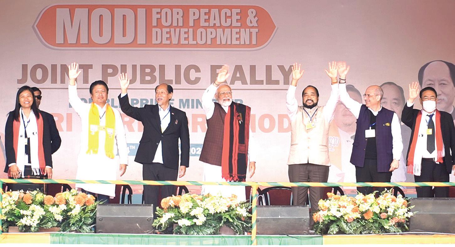 The prime minister spelt out BJP’s core objectives for Nagaland while addressing a joint rally of the BJP-NDPP alliance at a jam-packed Agri Expo ground, Chümoukedima on Friday. Those present at the rally included chief minister Neiphiu Rio, deputy CM Y. Patton, all five NDPP-BJP candidates from Dimapur, Chümoukedima and Niuland districts, Central and State BJP leaders and senior NDPP officials.