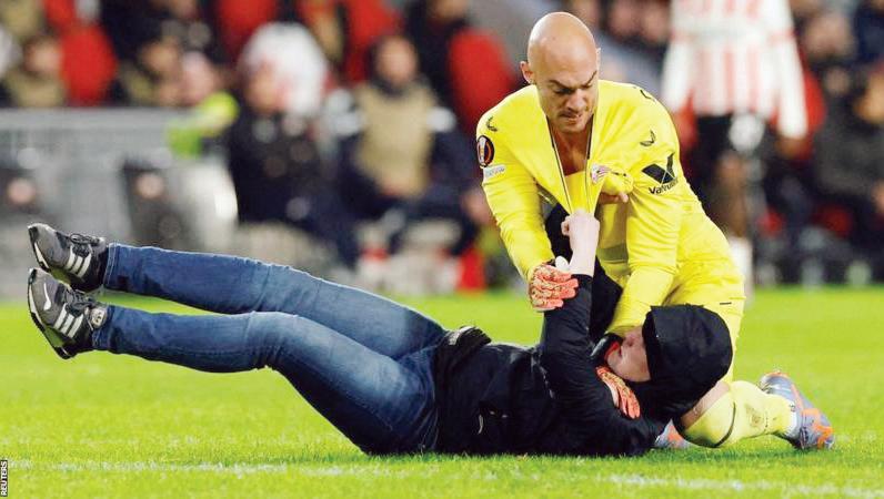 Sevilla keeper Marko Dmitrovic wrestles the fan to the ground.