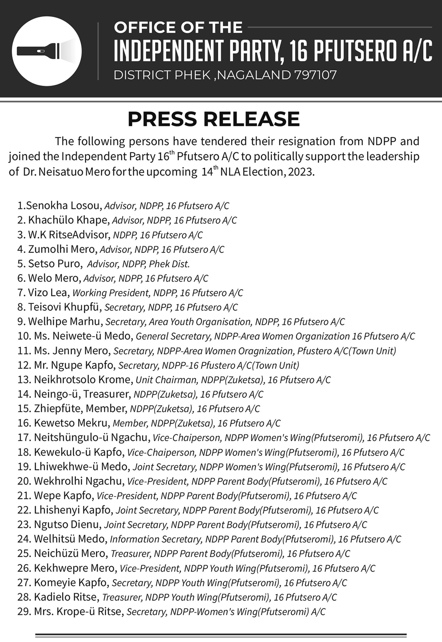 It said that the main aim objective of LJP was to bring changes in Nagaland be political or social development and to uplift the minority and the people as whole and also bring about socio-economic development, education, infrastructure and most importantly the long standing Indo-Naga solution. Meanwhile, LJP (RV) welcomed all like-minded parties to join them in a post-alliance to form a government to work together in bringing changes in Nagaland.