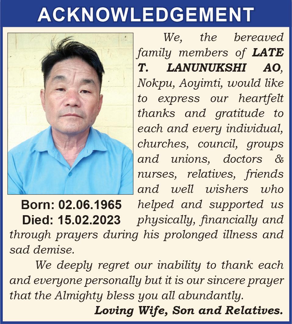 The bereaved family of Lt. Tsenchibemo Ovung of Lotsu Village would like to express our heartfelt gratitude to all those who offered their condolences and support during this difficult time following his passing. We are deeply grateful for the outpouring of love and support from family, friends, and community. We would also like to extend our thanks to the healthcare professionals and caregivers who provided compassionate care to him during his brief illness. We regret our inability to thank each and everyone of you individually but we hope that this message of gratitude will reach everyone who has reached out to us as we cope with this painful loss. Thank you again for your support and for being a part of our lives during this difficult time. We pray that the good Lord bless each and everyone of you abundantly. Loving children, grand children, great-grandchildren, & In- Laws