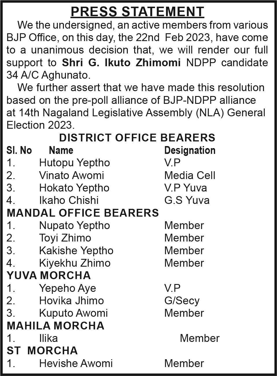 The party also called upon all right thinking citizens of 38 Wokha AC to condemn the illegal activities and not to be swayed by monetary enticements in true Christian spirit. BJP 38 Wokha, while reiterating to stand for free and fair elections, also appealed to supporters of both the parties to abstain from violence and unitedly work for peaceful elections.