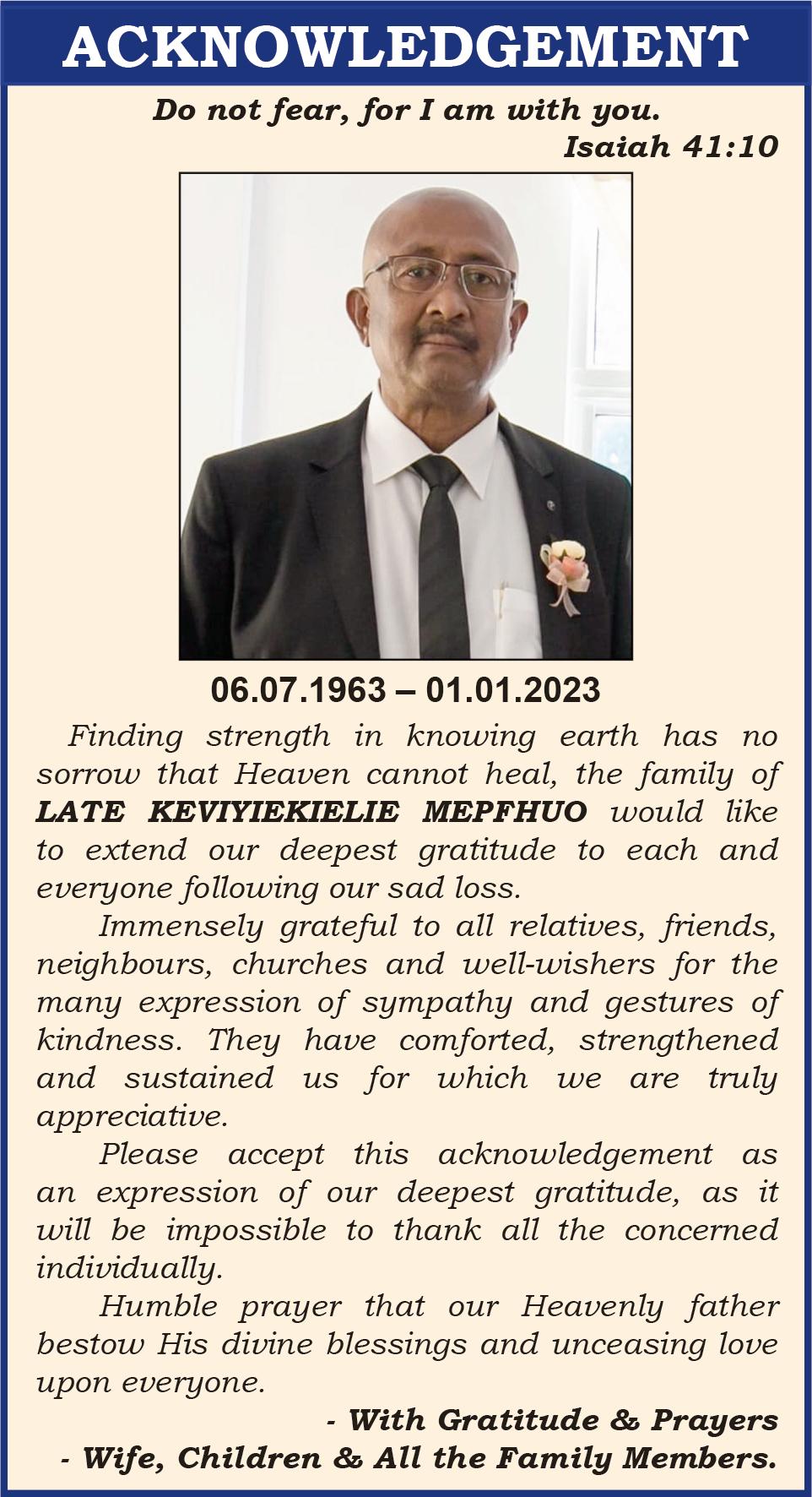 The family of Late Khrüküso Swüro of Ruzazho Village, who went to eternal home on January 11, 2023, would like to convey our sincere appreciation and thank all those who sympathized with us during this time of bereavement.