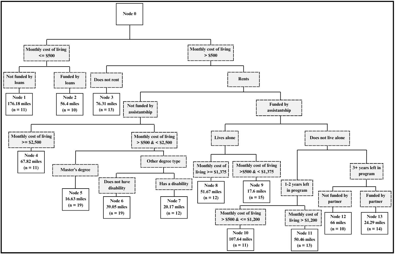 Figure 1 depicts the model results of the CART analysis in the form of a logic tree. Figure 1 can be interpreted by following the branches to understand node assignment. For instance, the seventh node (with an average commute of 78 miles per week) consisted of 32 students who, on average, paid more than $500 in rent/mortgage payments, did not live alone, were at least partially funded by a graduate assistantship, and identified as having a disability.