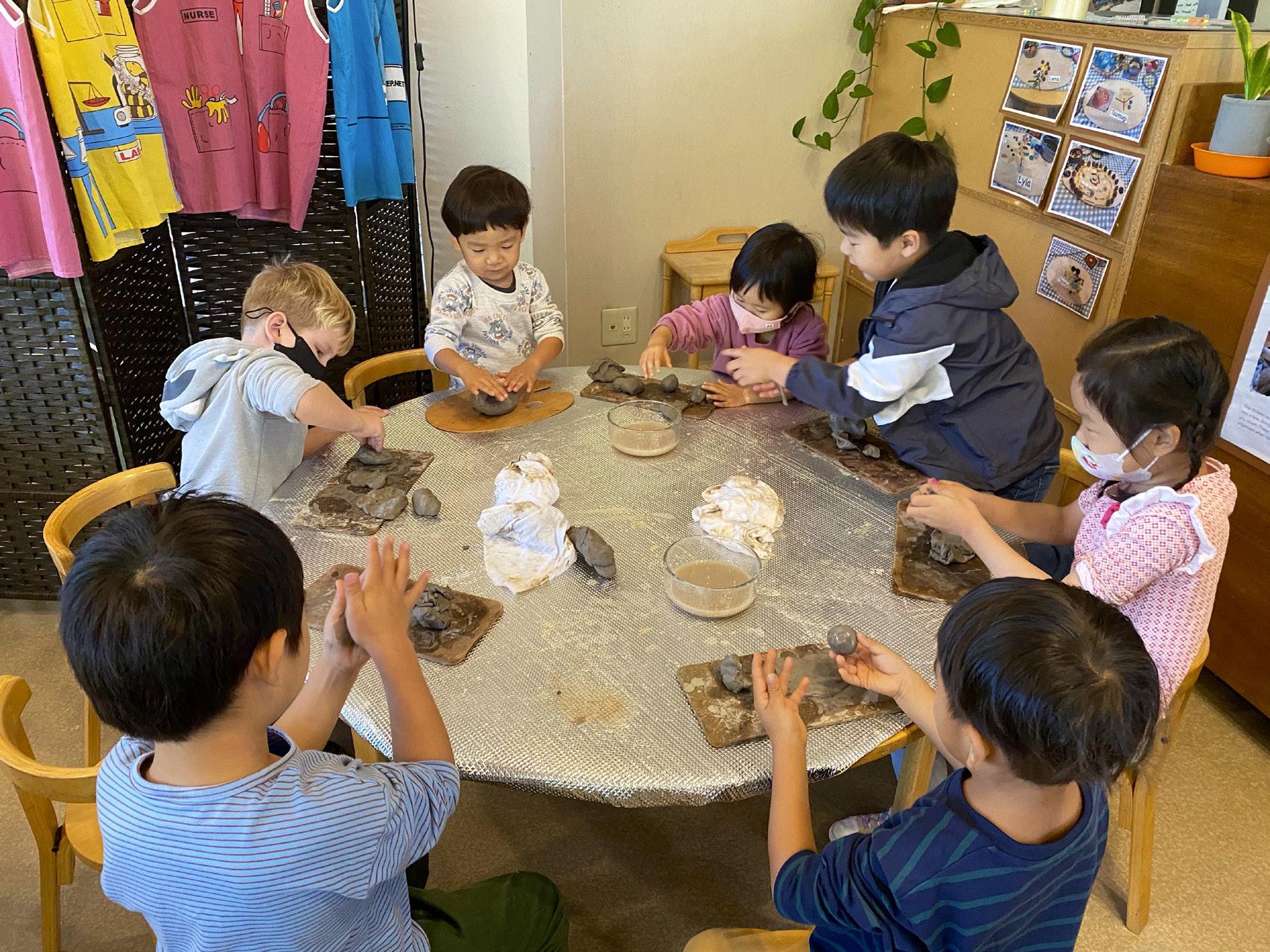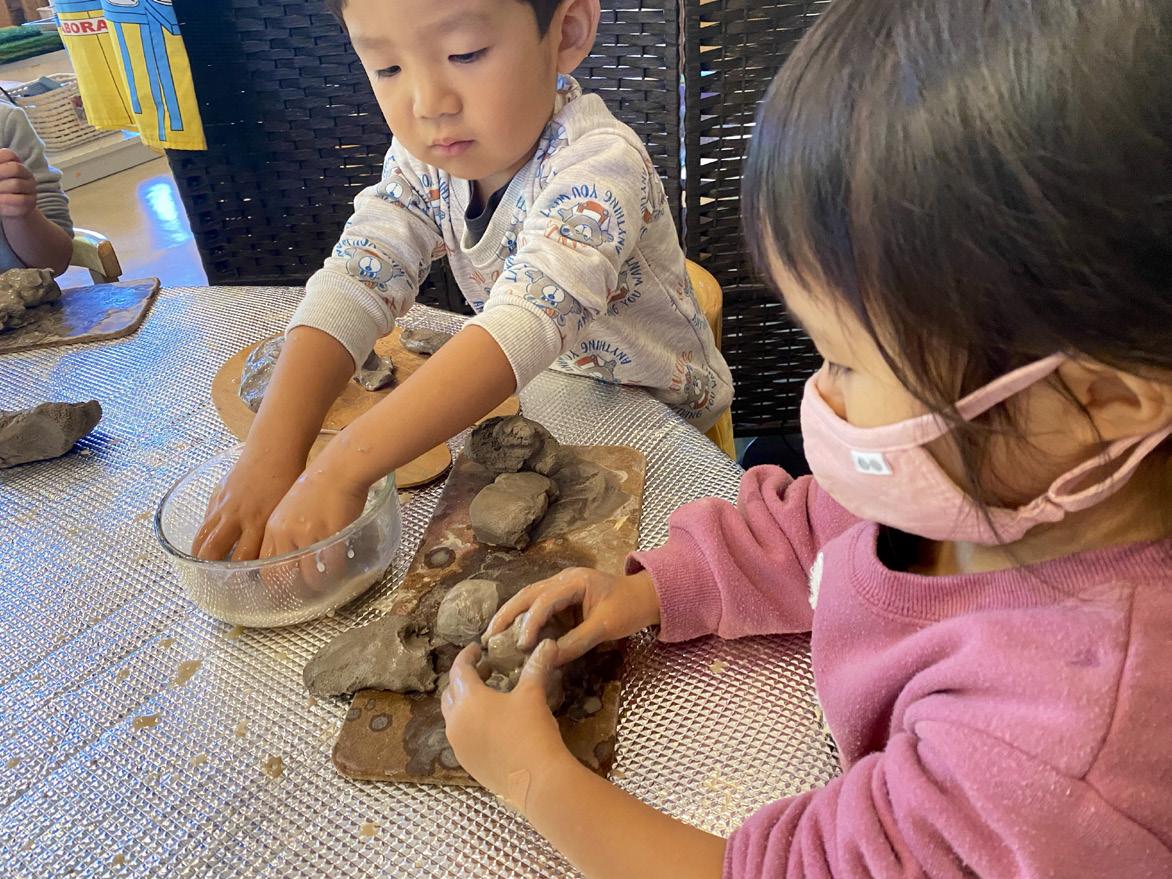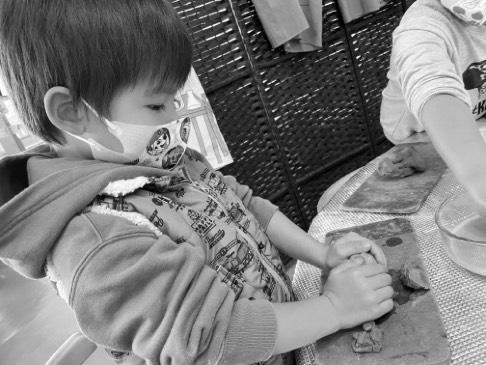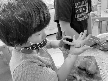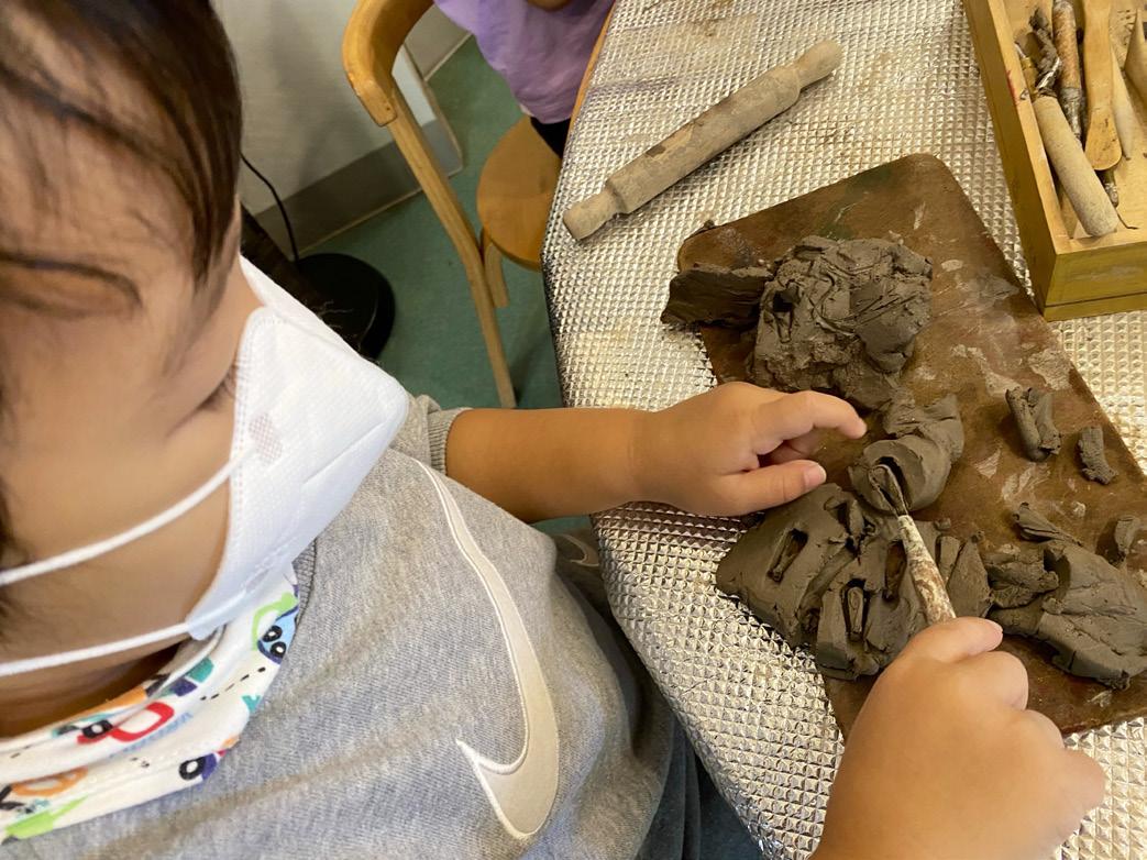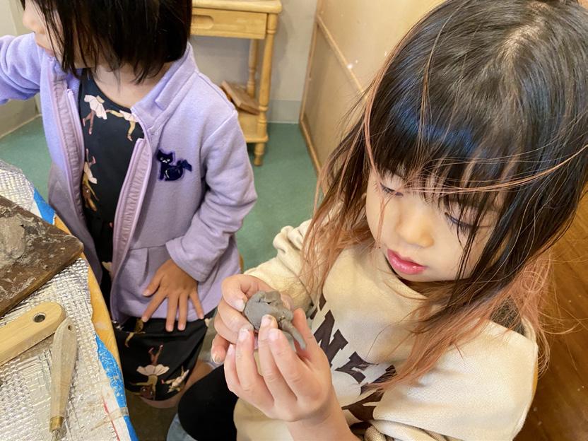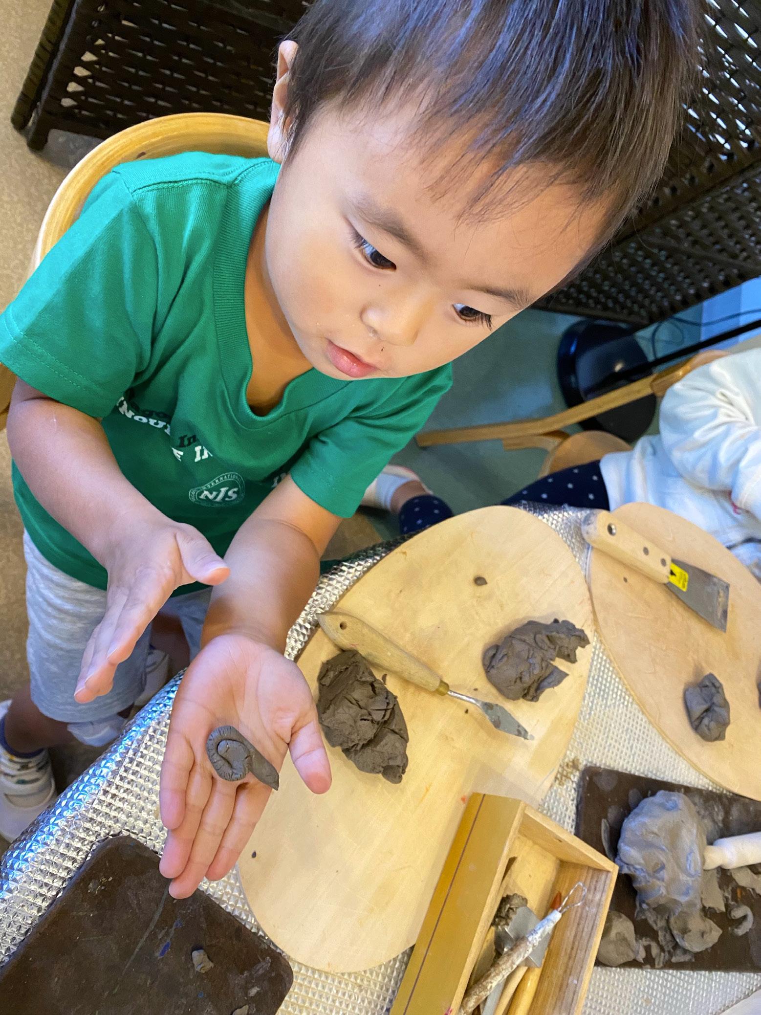 At first, the children were excited to try clay because they really enjoy working with Nendo in class and thought that clay was the same thing. But as soon as they sat at the table and touched it, many noticed and expressed that their hands got dirty. Some of the immediate reactions were,