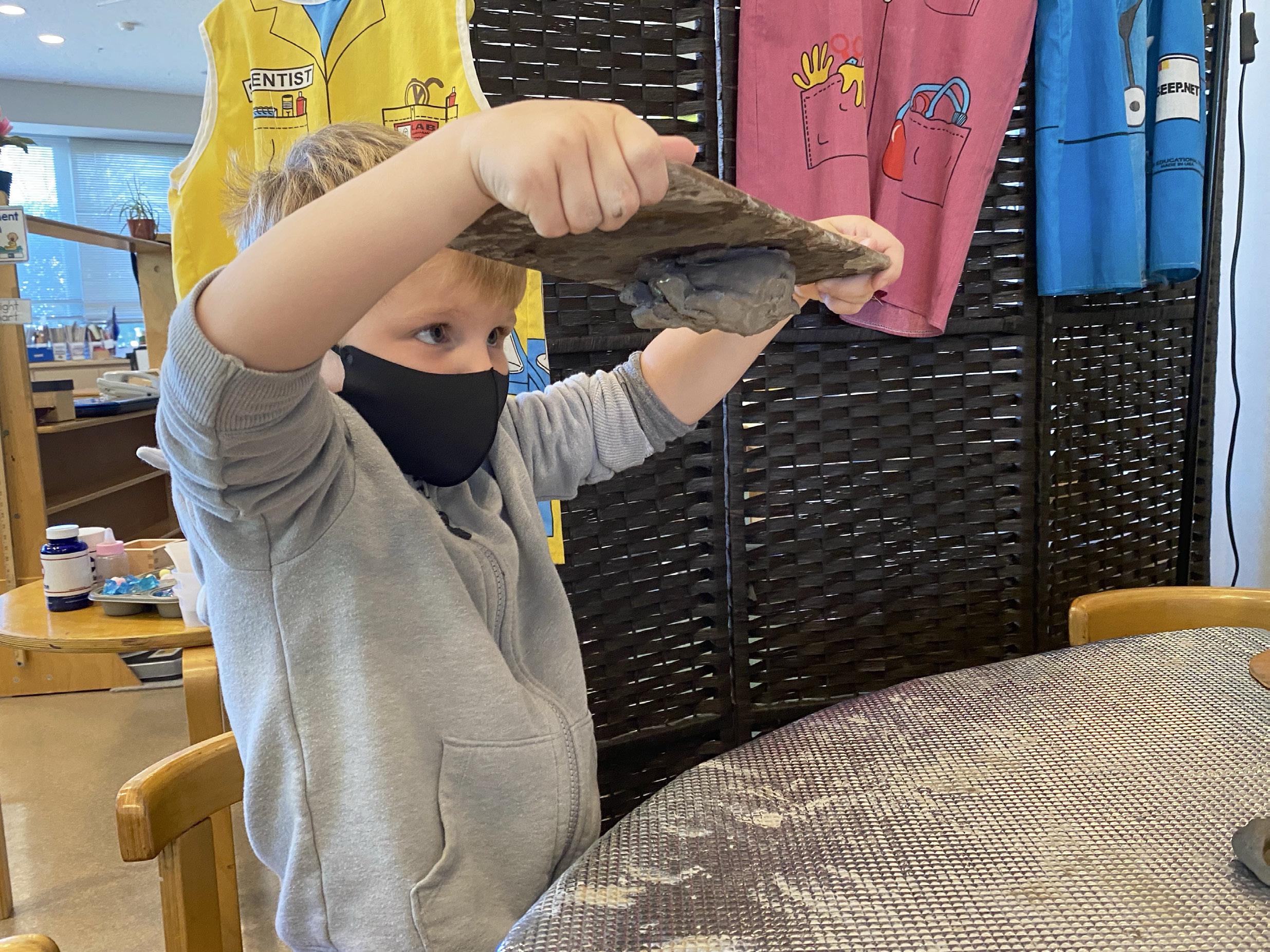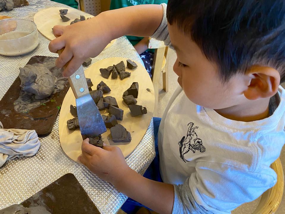 Once various tools were introduced, the children enjoyed cutting clay into chunks, scraping and peeling it, and poking holes. While some tools were easy to figure out, others brought out questions and wonders like,