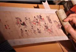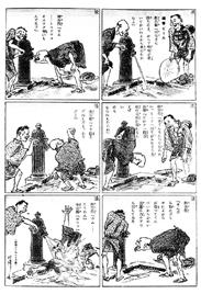 A nivel narrativo, son piezas compuestas por cuatro emakis cada uno, de formato alargado, que actúan como línea de tiempo en la que se representan a unos personajes que van adoptando diferentes posturas para crear en el espectador la idea del movimiento en el espacio-tiempo. Se utiliza la técnica de tinta sobre papel, en donde predomina el uso de la línea y el punto tanto en contornos como en las texturas visuales. Se juega con los grosores y las cantidades de tinta para modelar volúmenes o generar espacios y perspectivas. Esta técnica se utiliza actualmente para hacer mangas, comics y tebeos en general, bien sea mediante medios tradicionales o digitales.