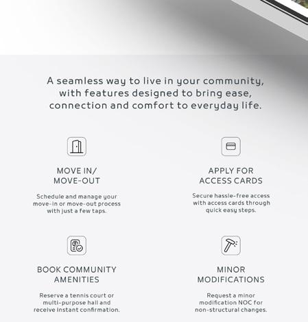 a hassle-free community experience with your community app. From managing your move in/out process, requesting minor modifications, or applying for access cards to even booking your amenities. All your needs are just a tap away.