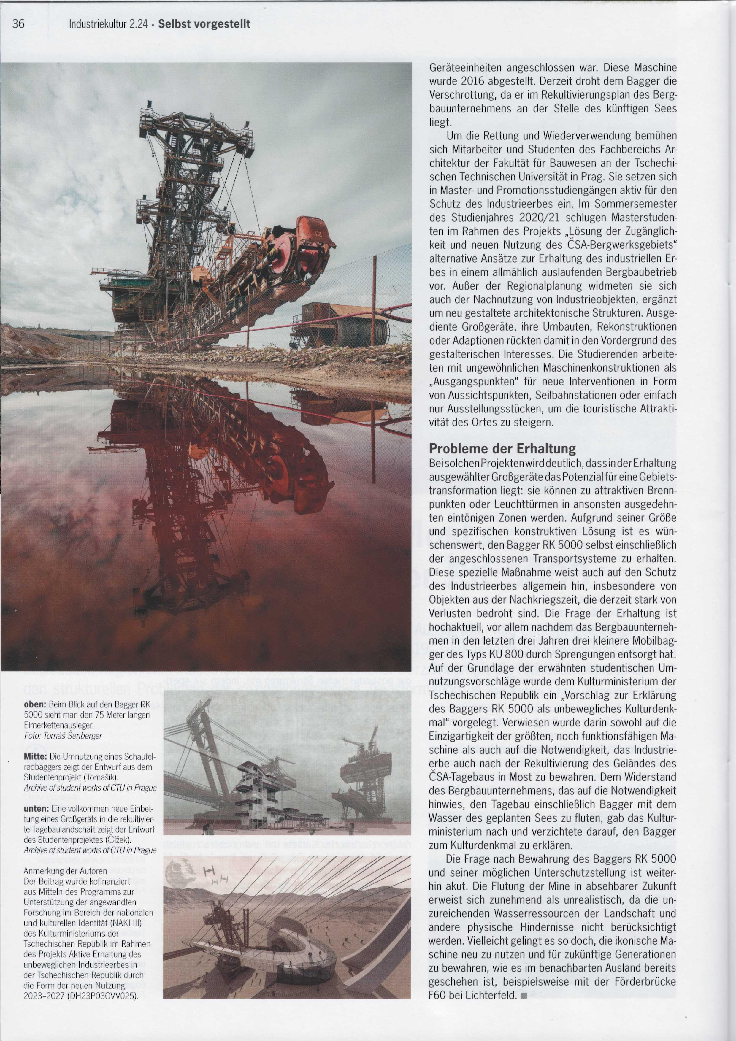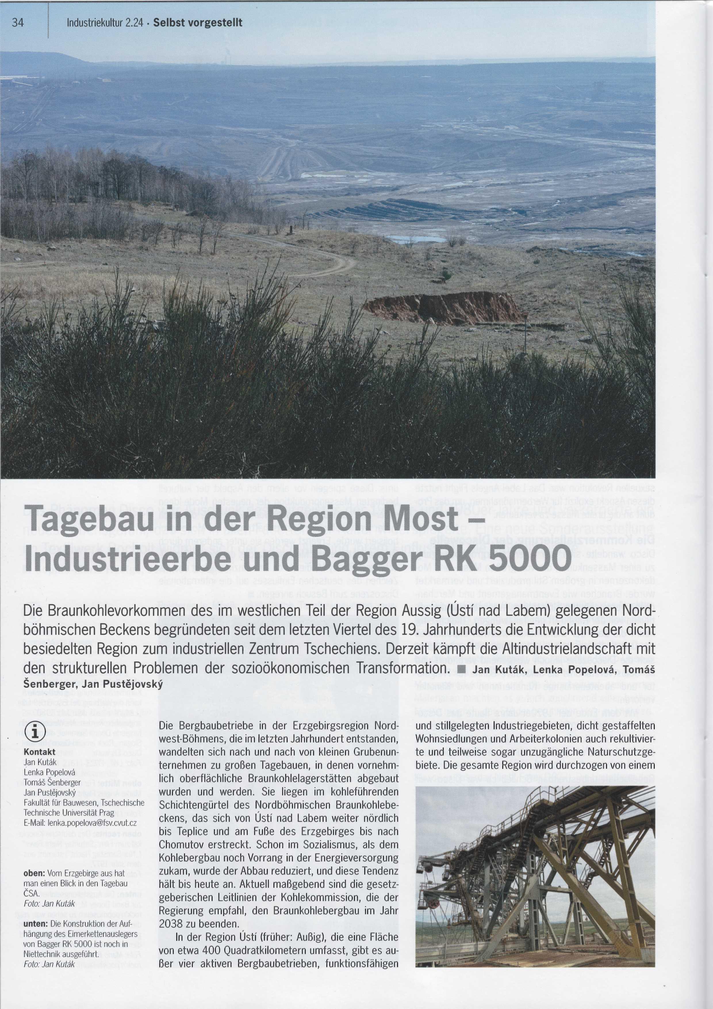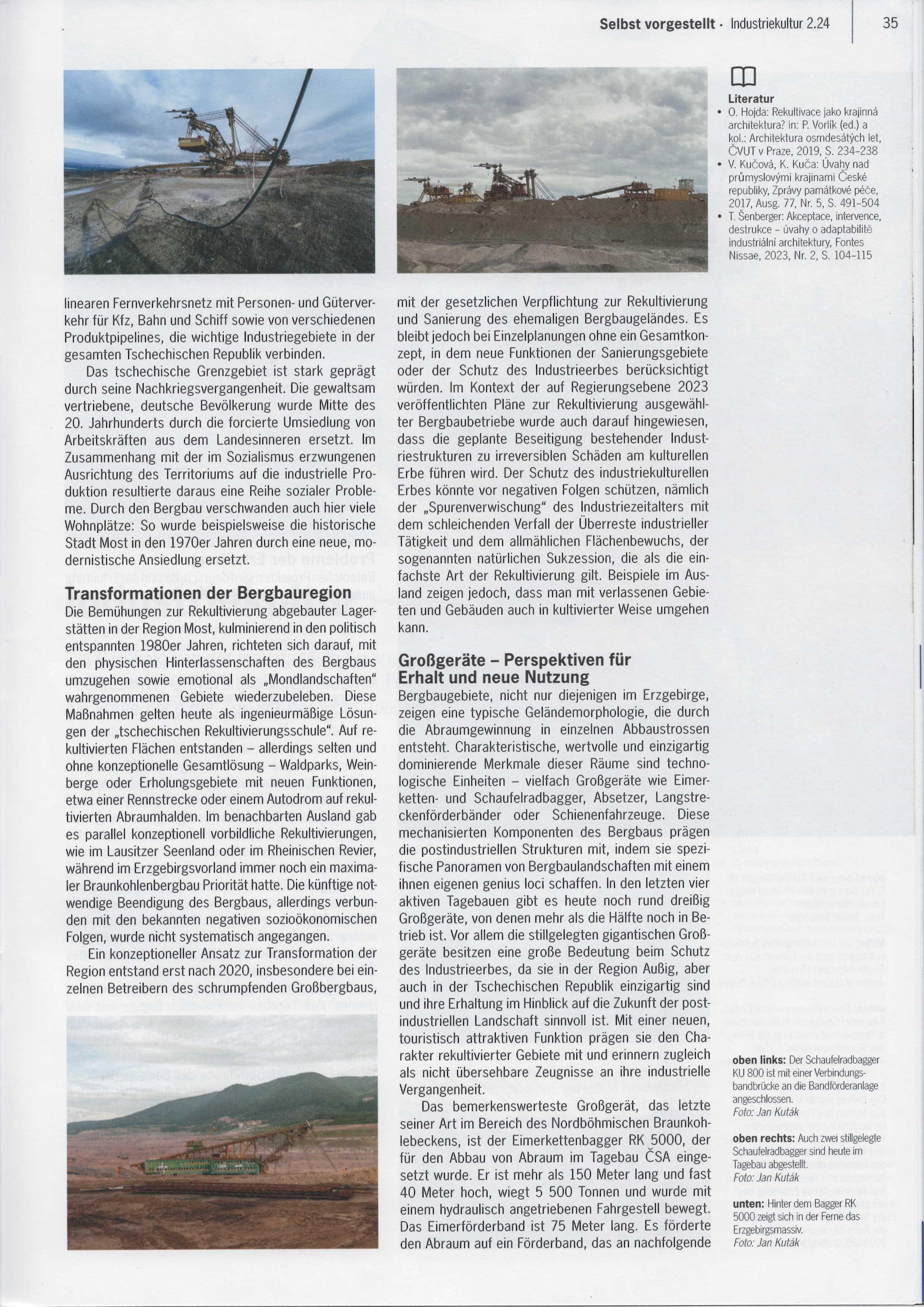 Článek publikovaný v německém čtvrtletníku Industriekultur, periodiku zbývajícím se tématy památkové péče, krajiny, sociálními a enviromentálními tématy a technologickou historií, nastínil německy čtoucímu publiku spektrum problémů, se kterými se potýká průmyslová krajina severozápadních Čech. Nejen kvůli své roztříštěnosti na pestrou mozaiku území s různou náplní, ale i kvůli chybějícímu konsenzu, jak koncepčně a s dlouhodobým výhledem s daným územím a vůbec postindustriální krajinou nakládat. Že na tom tratí samotný region a také předmět našeho zájmu, ochrana průmyslového dědictví, kdy dochází k jeho znehodnocování a „stírání industriálních stop“, je ve světle úspěšných transformací v Německu více než jasné.