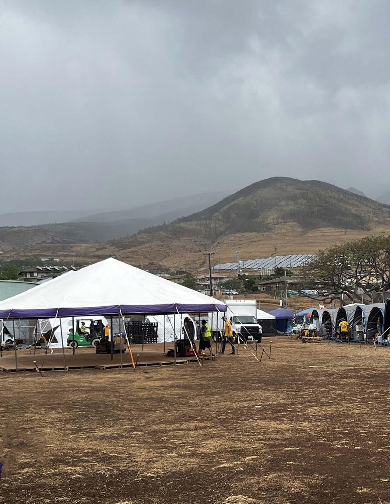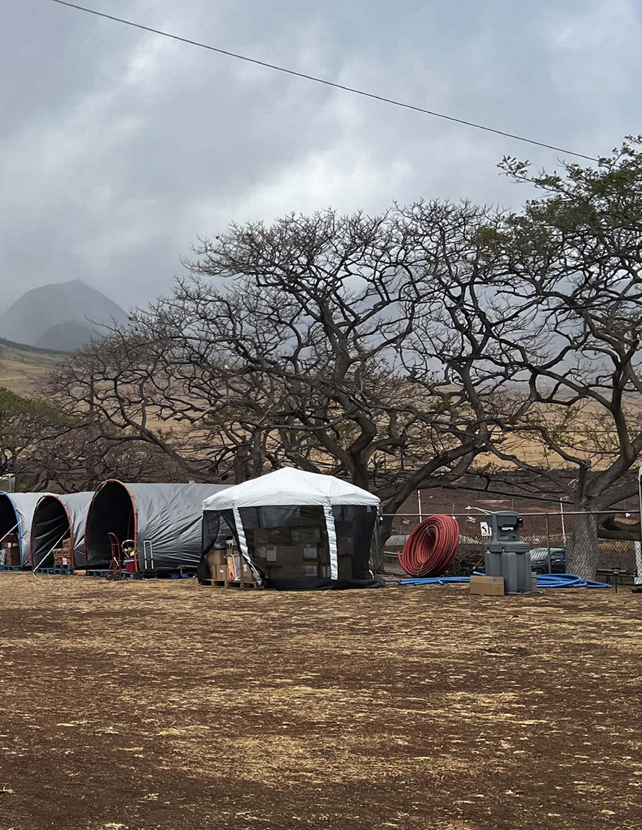 In late September, we showed up with a small army of volunteers to help build an off-grid tent city in Central Maui to house Lahaina’s houseless community as they were being evicted from hotels and had nowhere to go. Due to the timeline, we had three days to transform an open industrial lot into a small city with residential units, kitchen, cafeteria, intake and medic tents, bathrooms/showers, recreation areas, and off-grid water and electrical infrastructure—including air conditioning for all the tents!