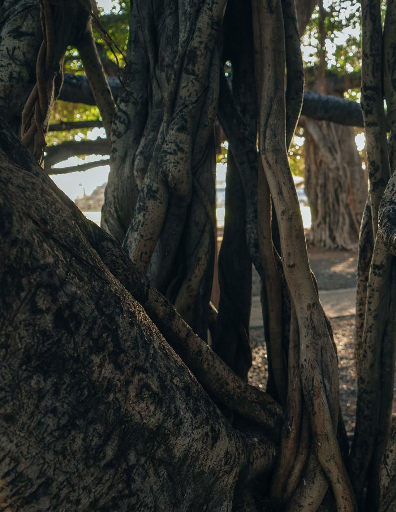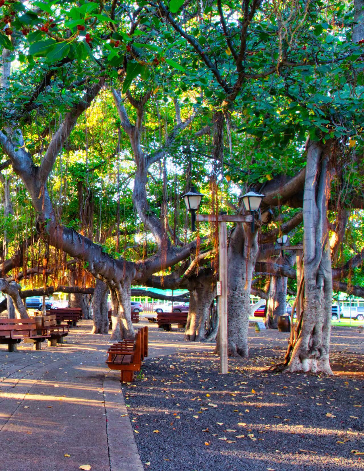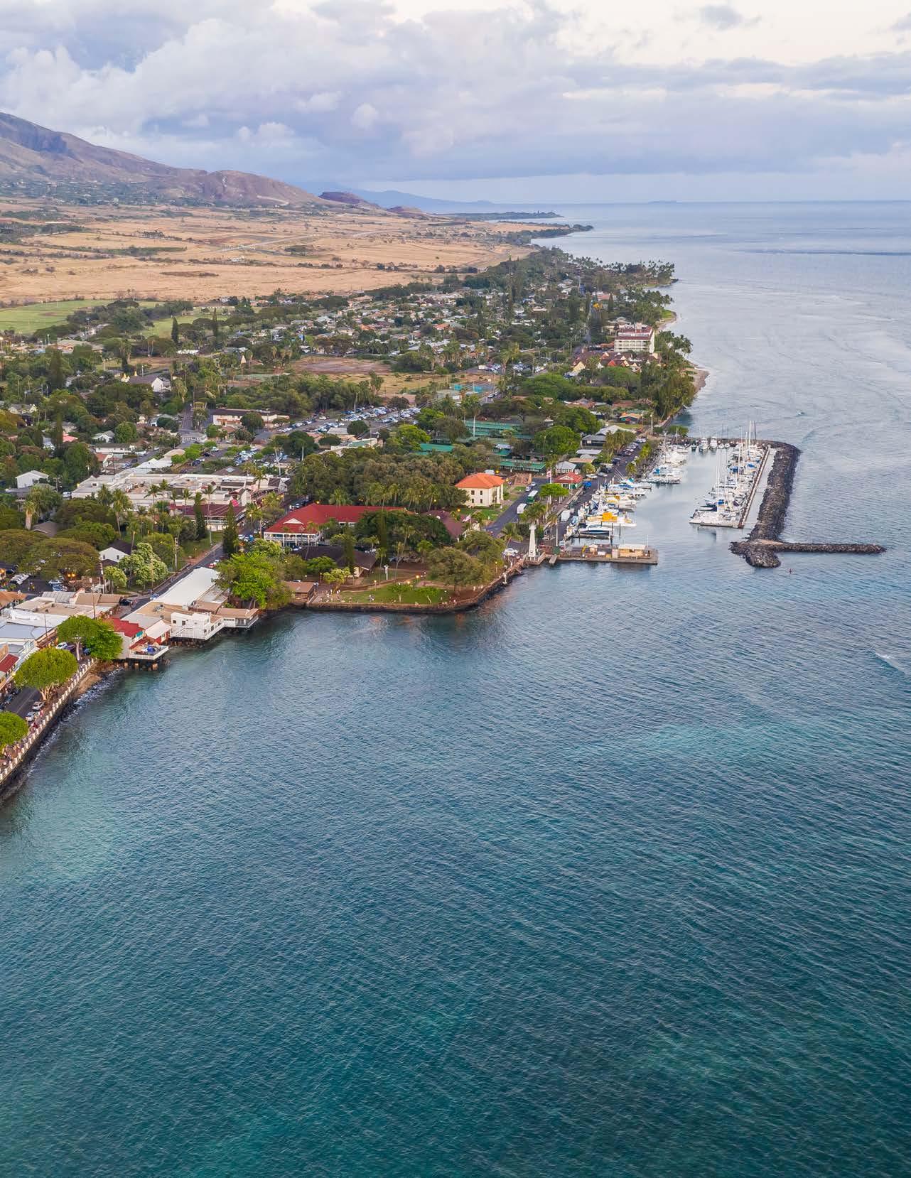 Come take a glimpse for just a moment through our eyes. Imagine we have paddled out on a canoe and we are looking back at Lahaina. We see homes clustered in neighborhoods where children play and kūpuna sit on lānai—their gentle eyes taking in the beauty of a vibrant and thriving landscape. The island is green from the mountains to the sea, and we see well-established groves of ‘ulu offering cool shade while life-giving waters flow freely along ancient pathways feeding the pond at Mokuhinia. Food is growing in abundance, nourished by drenching Ka Ua Pa’ūpili rains, providing sustenance to ‘ohana that have lived on these lands for generations. Native Hawaiian values and practices are embraced by a community that celebrates its interconnectedness and diversity. Locally-rooted and community-centered businesses are thriving, and Front Street is a beloved hub of social, cultural, and economic activity connected by our shared values of aloha ‘āina and aloha kekahi i kekahi—love for the land and for one another. Generations have gathered under the dense foliage and curving branches of Lahaina’s beloved banyan tree, while laughter makes audible the deep joy rising like a spring in the hearts of the people.