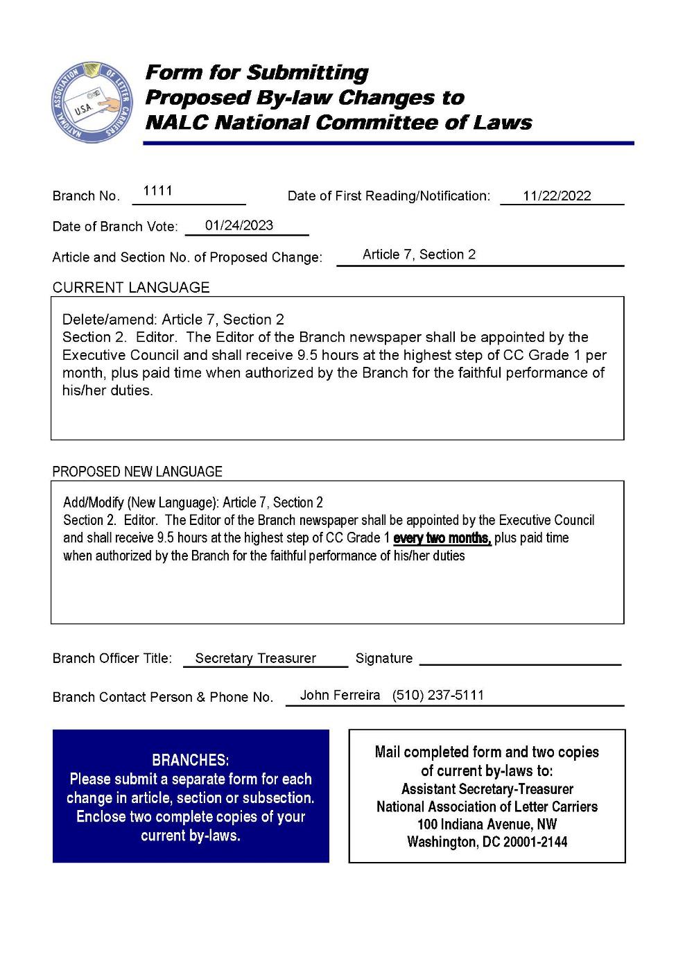 Branch 1111 News is the official monthly publication of the National Association of Letter Carriers (NALC), Greater East Bay Branch 1111. Circulation 3,000