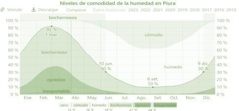 En Piura la humedad percibida varía extremadamente El período más húmedo del año dura 6.0 meses, y durante ese tiempo el nivel de comodidad es bochornoso, opresivo o insoportable por lo menos durante el 30 % del tiempo.