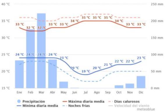 CLIMA 1 Asoleamiento Enero a Abriltemporada mas mojada Abril hasta enero temporada mas secaVientos de sur a norte deRosavientos Viento de suroeste a noreste Precipitación Temperatura máxima y mínima promedio en Tambo Grande Durante el transcurso del año, la temperatura generalmente varía de 20 °C a 34 °C y rara vez baja a menos de 18 °C o sube a más de 36 °C
