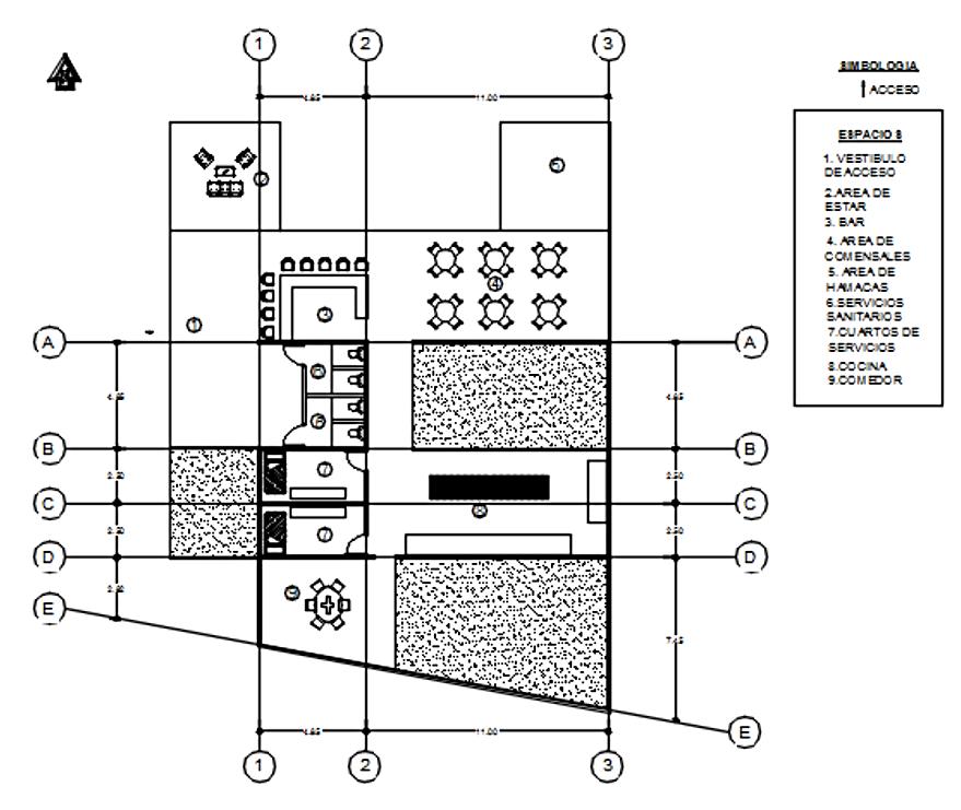 Cuenta con los siguientes espacios, posee son una zona pública y privada; zona publica se encuentra un lobby, un bar, área de comensales con vista al volcán Masaya, área de hamacas, mirador con una hermosa vista hacia la laguna y volcán Masaya, y baños públicos; en la zona privada se encuentra la cocina, en ella están 2 cuartos de servicio, lavandería, área de tendederos y el área de almuerzo de los trabajadores Este restaurante cuenta con un área de 180 m2