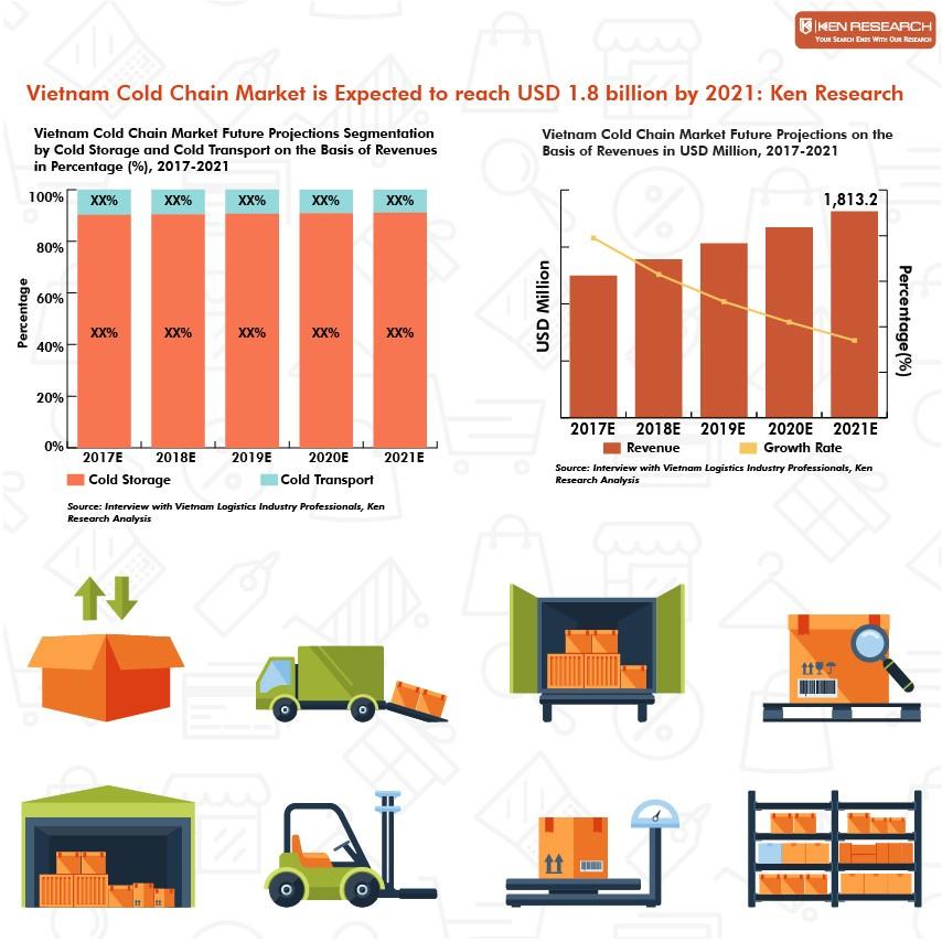 Báo cáo có tiêu để "Thị trượng chuỗi cung ưng lắnh Việt Nam theo kho lạnh và vận chuyển lạnh, loại sản phẩm (Bánh, Bánh kẹo, Sữa, Thịt &; Hải sản, Vắc xin & Dược phẩm, Trái cây & Rau quả, Hóa chất) – Triển vọng đến năm 2021" cụa Ken Research cho thắy CAGR