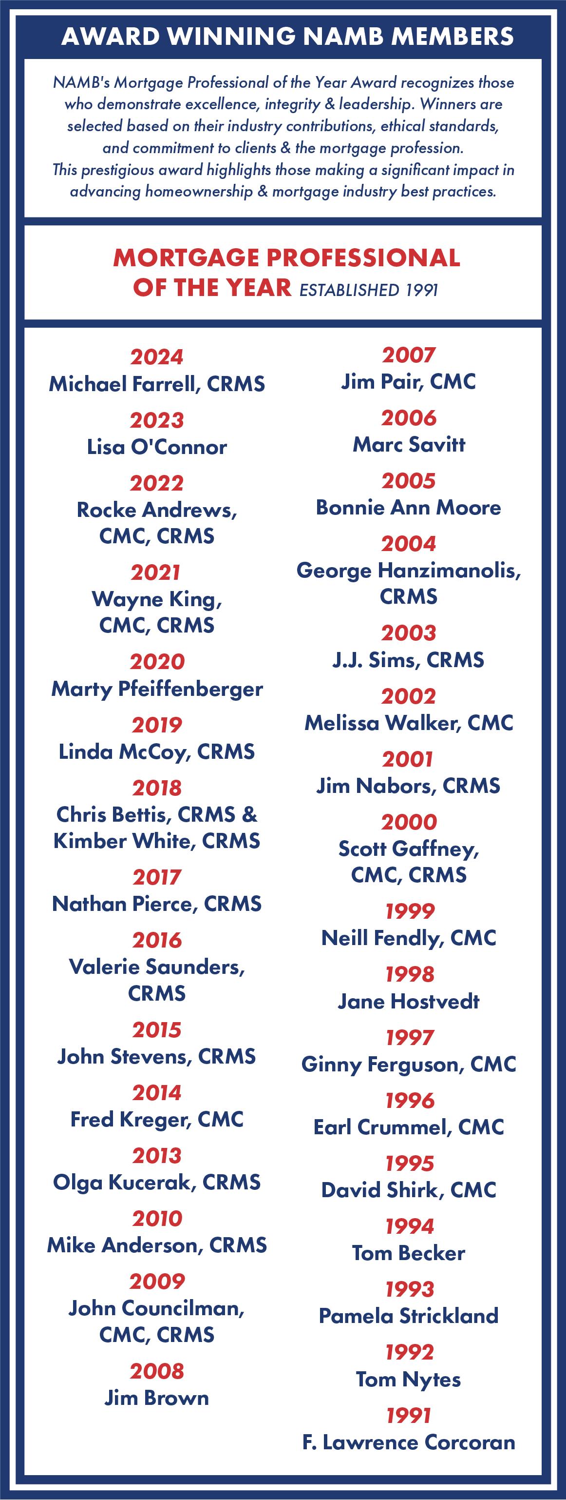 Mike Farrell, our incoming President-Elect & Membership committee chair, and his team have increased our head count by 300 percent in the last two years. They’ve also added a liated state associations in California, Texas, Florida & the Carolinas. And they’ve recently established the YP (Young Professionals) committee for LOs under 35 to gain knowledge & guidance to grow their business. Mike also spent hours on TAFAC (The Appraisal Foundation Advisory Committee) so that NAMB now has a partner’s seat on its Board of Trustees.