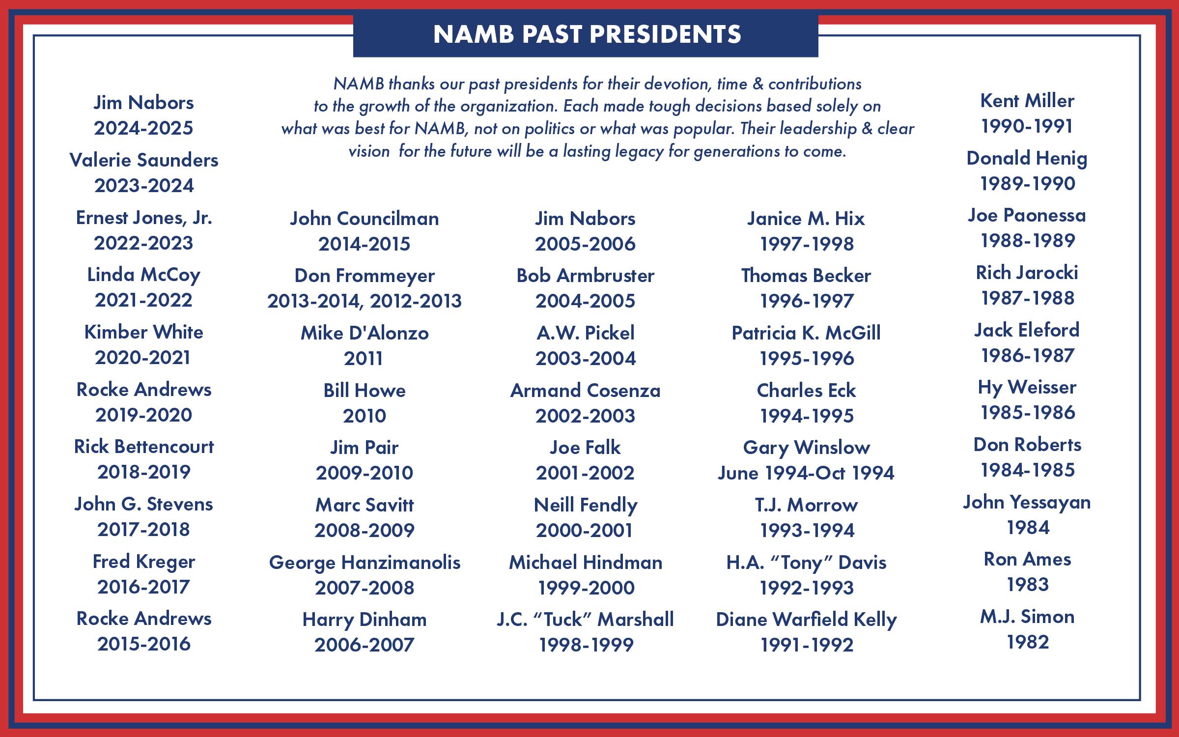 Through it all, NAMB has adapted, thrived & evolved. We’ve positioned ourselves as the leading trade organization for mortgage professionals & small business owners across the nation. We've strengthened our advocacy e orts, expanded our educational resources, and built stronger bridges between brokers, lenders & regulatory bodies — all while remaining true to our core mission: championing the interests of mortgage brokers & the borrowers they serve.