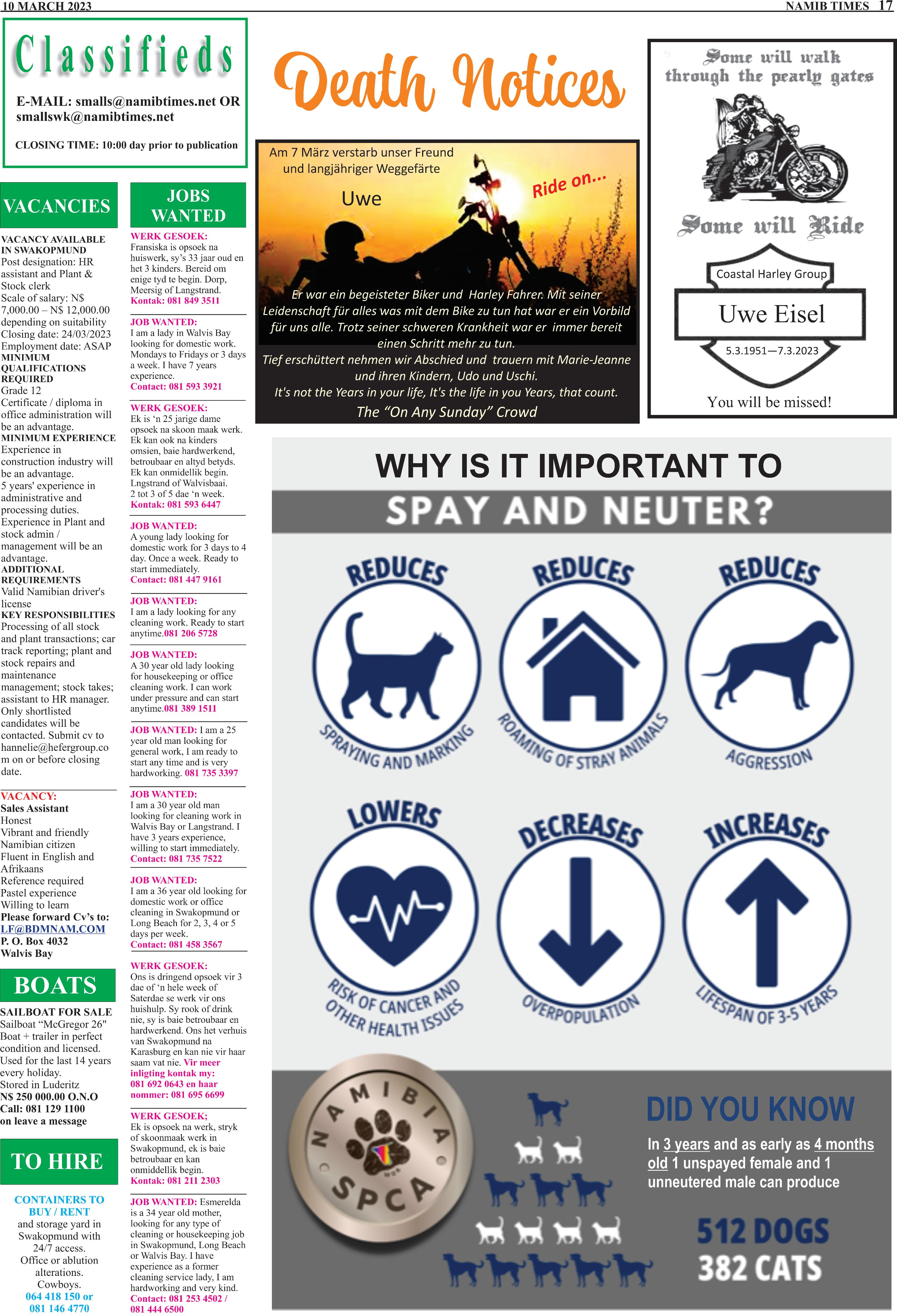 namibtimes Tel: +264 64 - 205854 / +264 64 - 461866 /Fax: +264 64 - 204813 / 064 - 461824 / Website: www.namibtimes.net SERVING THE COASTAL COMMUNITY SINCE 1958 NO 7006 FRIDAY 10 MARCH 2023 N$6 inside Page 20 Page 7 Page 2 Page 3 Sports News