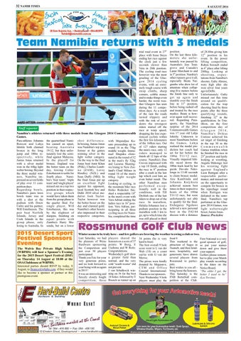 Staff reporter Namibia's athletes returned with three medals from the Glasgow 2014 Commonwealth Games. Para-athletes Johanna Benson and Lahja Ishitile both claimed bronze in the long jump and 100m res p e c t i v e l y, w h i l e Junias Jonas returned with a silver medal won in the 64kg light welter boxing. Beyond the three medal winners, Namibia impressed on seven fields of play over 11 competition days. R eg a rd i ng bo w ls , Namibia's pairs lawn bowls team was in with a shot at the podium with Douw Calitz and his partner, Will Esterhuizen. The pair beat Norfolk Islands, Jersey and Cook Islands in the group phase, only losing to Australia. In