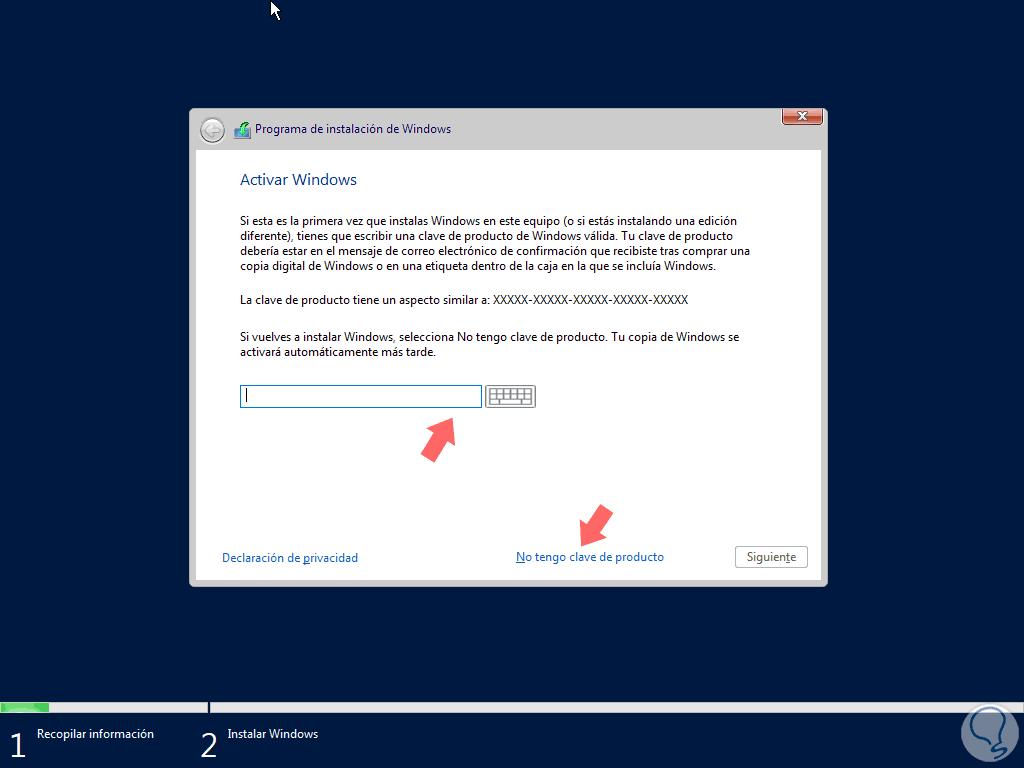 Una vez concluya la instalación, será desplegada esta ventana donde ingresaremos la clave del producto ofrecida por Microso o bien, si no la tenemos, dar clic en la línea