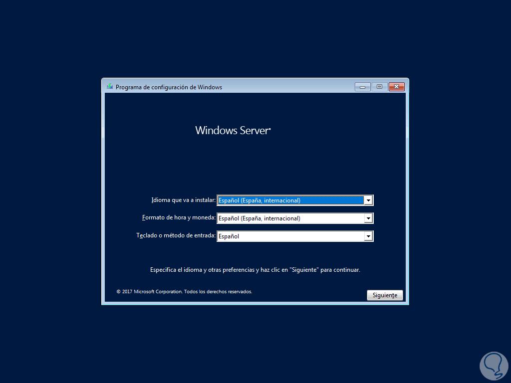 Después de instalar el ISO, iniciemos el proceso de arranque veremos la siguiente ventana de Windows Server 2019. Allí el sistema estará en el idioma que hemos descargado y será posible configurar detalles como su hora, moneda o teclados.