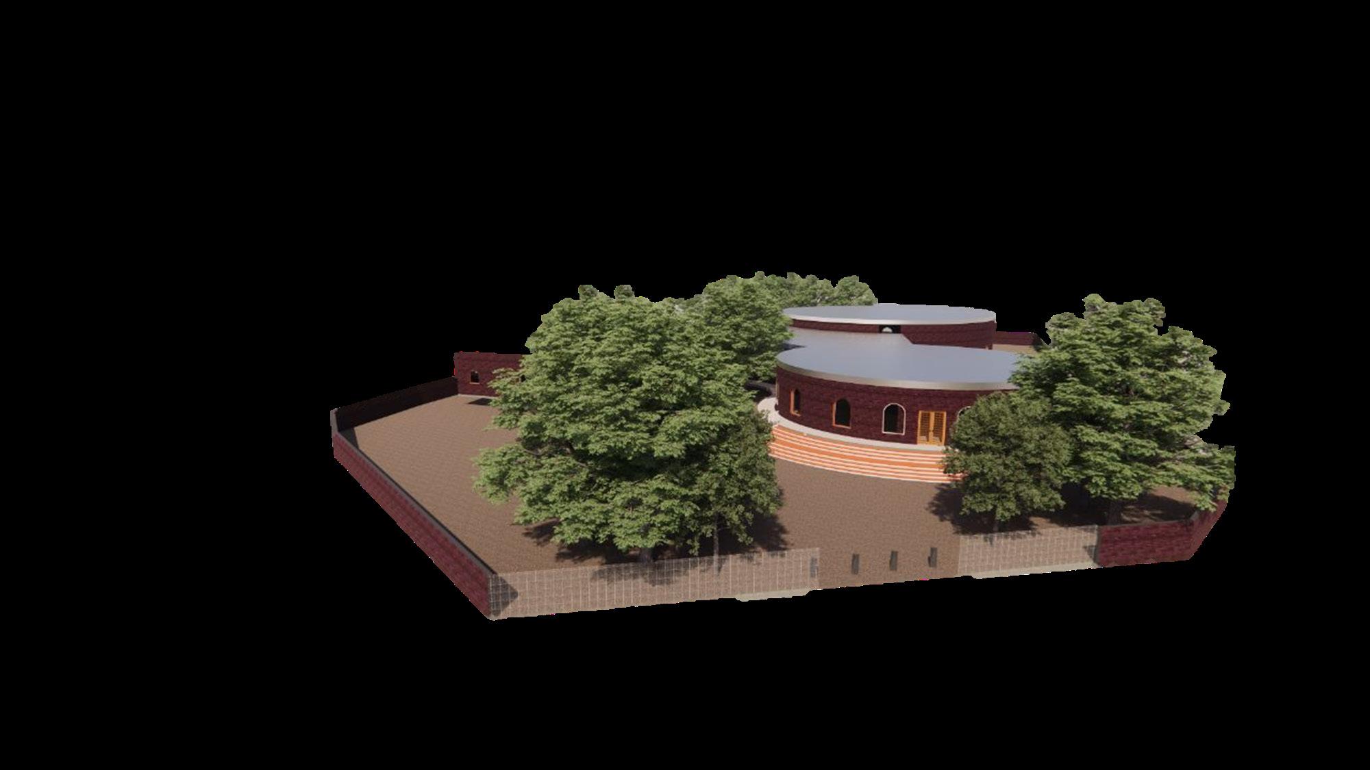 Jali wall is raisen ro the height of the ceiling. There is green vegetation and small water channel right beside the Jali for passive cooling technique. For passive cooling of site in South - West. The jali, vegetation and all other materials are locally procured in Telangana for a sustainable aproach towards the Design.