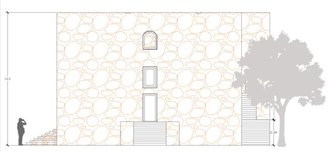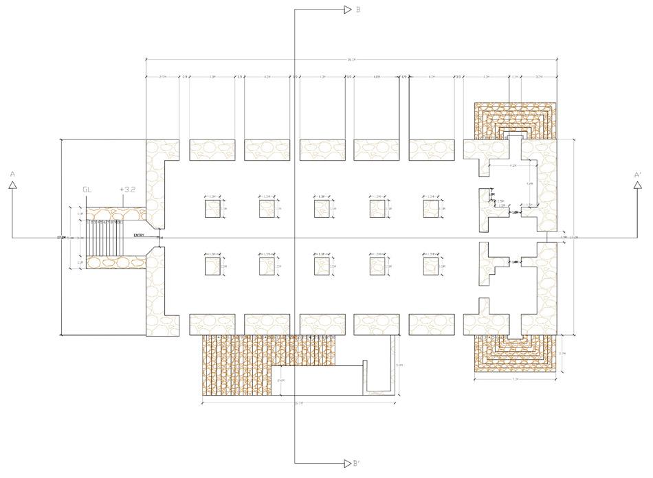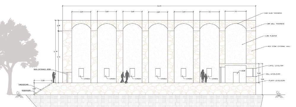PLAN ELEVATION SECTION Red sandstone is used to construct the 14-meter-tall Gandikota granary. Columns are built using stone masonry, plaster, and lime & mortar. The structure stands on a plinth of approximately 1.2 - 1.3 Meters tall and stands alone on 12 columns. Each of the walls the around 1M thick and is completely made of stone and plastered with lime on it.