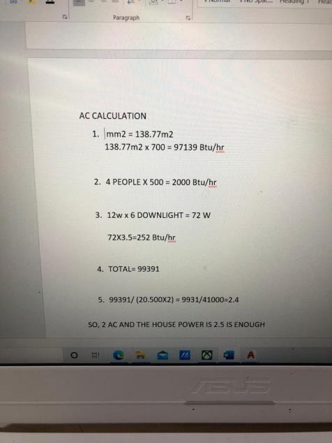 1. 2m X3m= 6m2 = 6m2 x 700 = 4200 Btu/hr