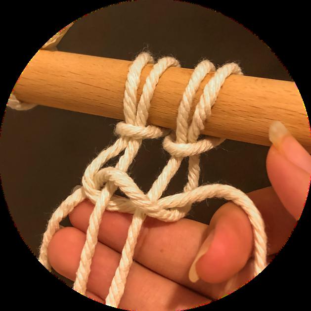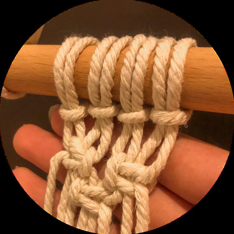 Make the shape ‘4’ from one of the outer strands (the right) as it creates a hole, insert it with the other outer strand. After that repeat but start from the different outer strand (the left). Each row takes about 3 minutes to be done.