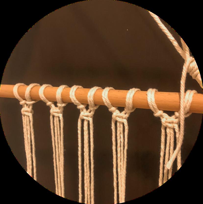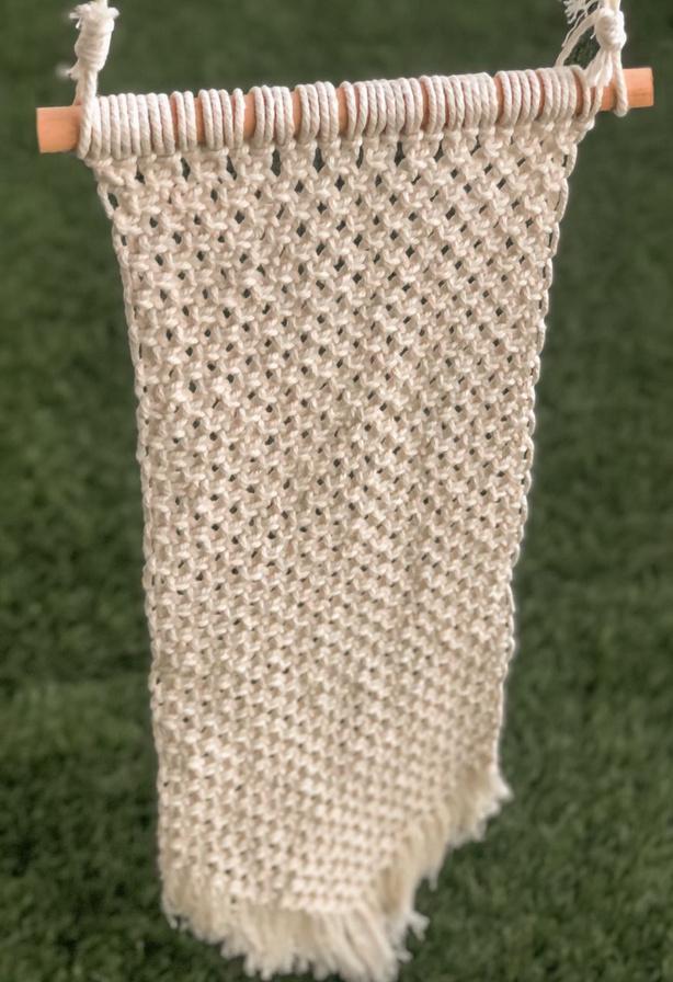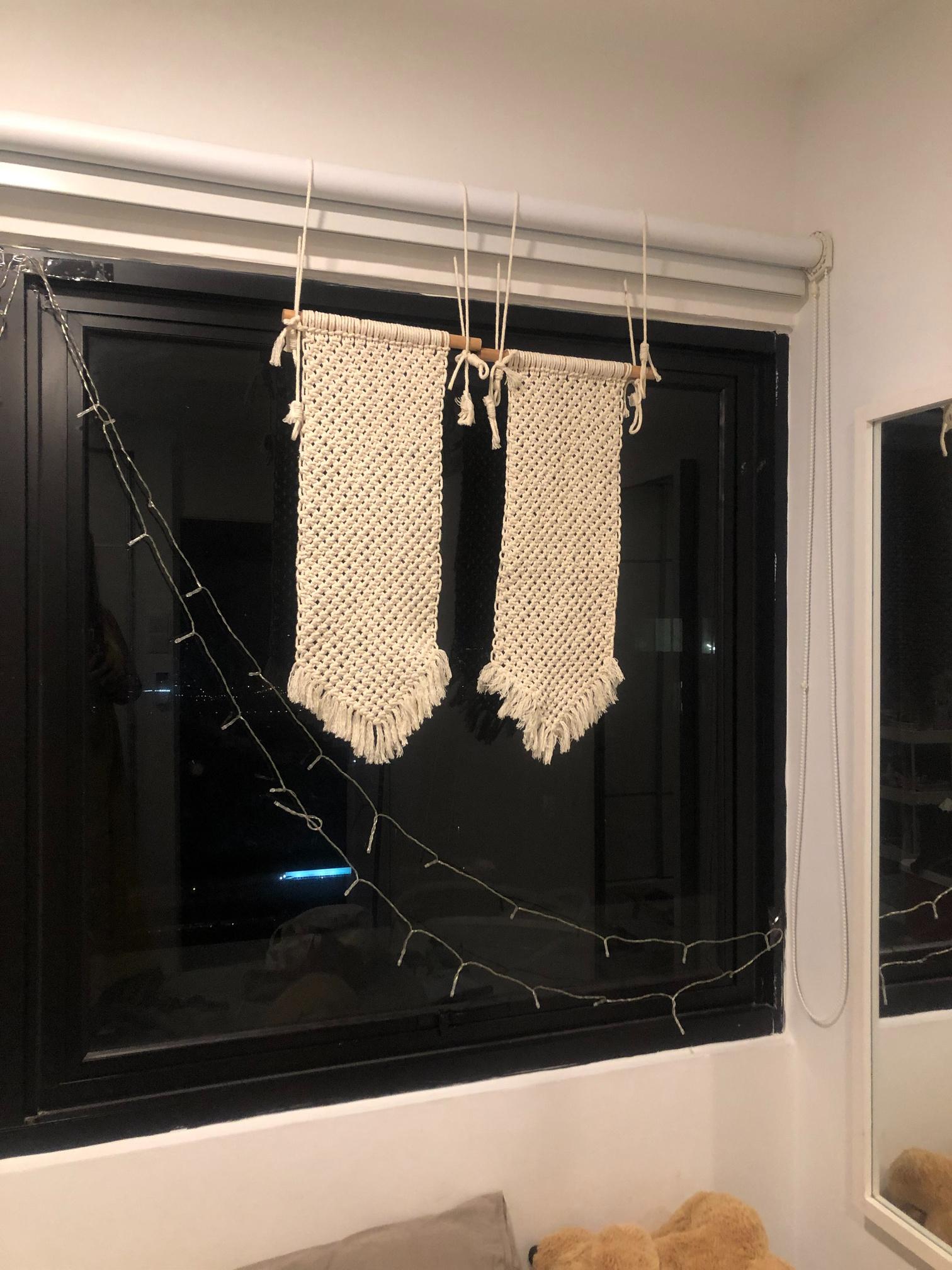 Here you can see I hung it by tie the rope then hung. if there is a big gap, the design of the macrame can be slide in further (all explanations were mentioned during presentation).
