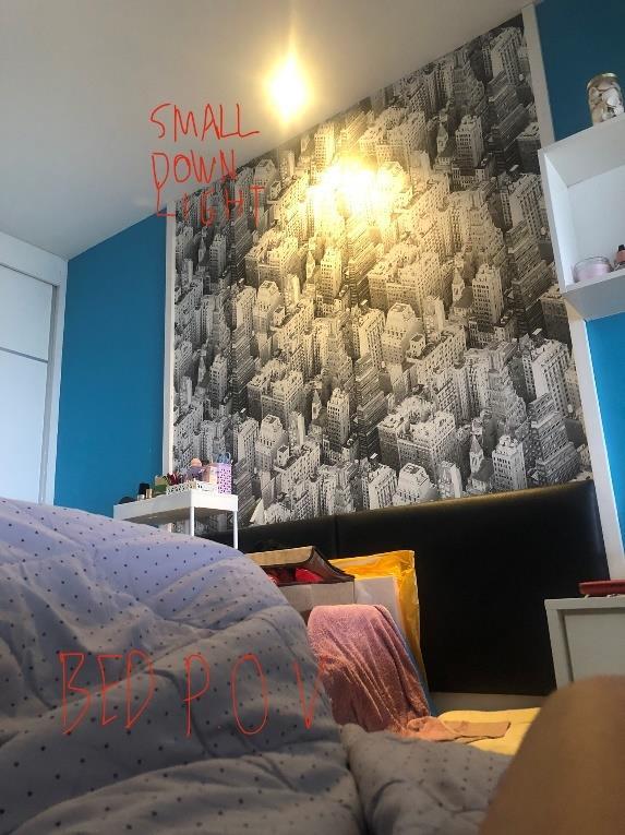 4. The placement of the small downlight. The bed was actually supposed to be under that small downlight It is literally on top of it so when I lay down, I will be facing straight to the light, but even though I move my bed, I’m still facing that light which makes it harder for me to fall asleep. So, the solution is better to not have the smaller downlight at all or add a study lamp so it is less bright for nighttime