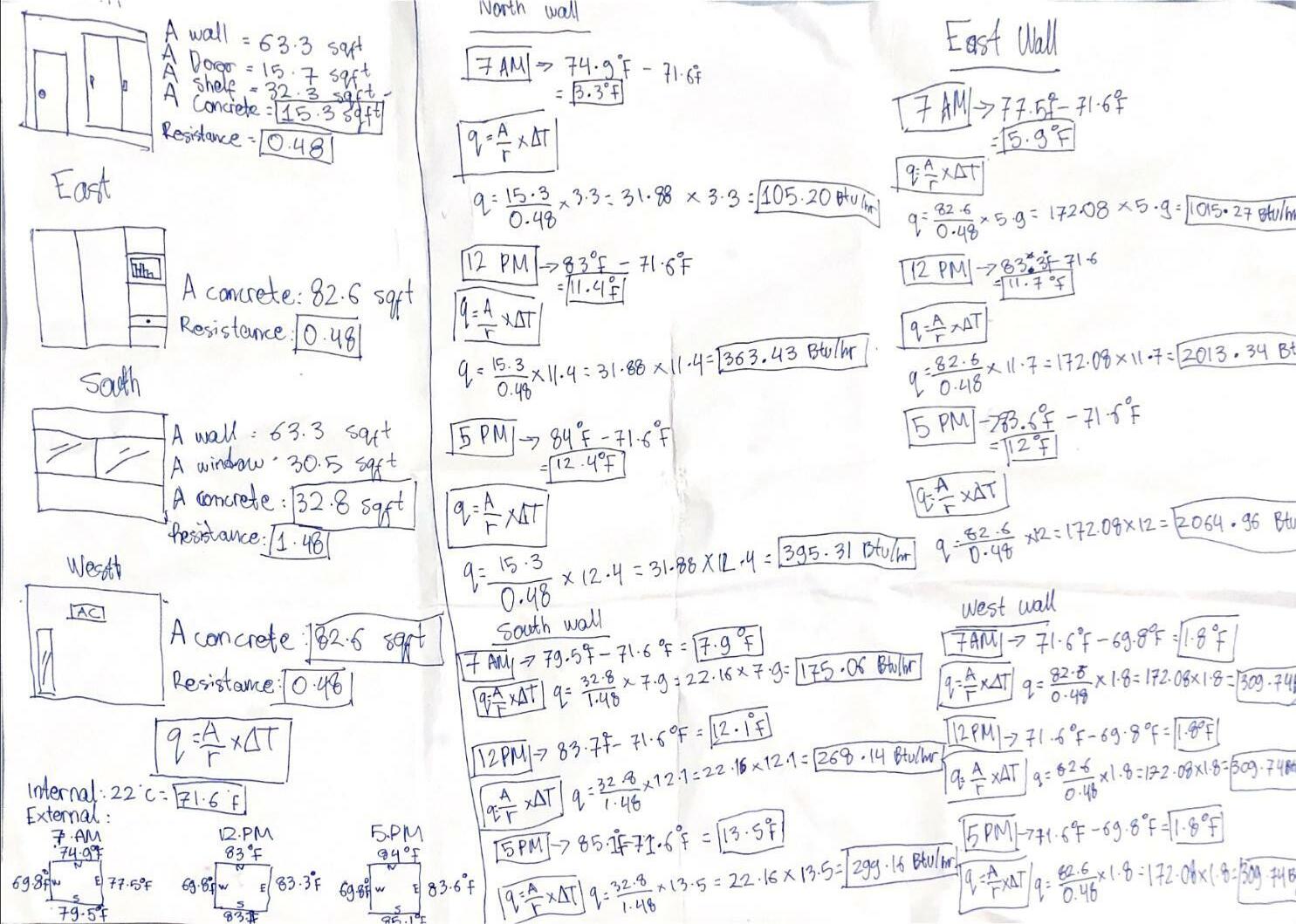 - THE TEMPERATURE WISE, EVERY WALL AT 5 PM, THE BTU/hr IS HIGHER BECAUSE FROM THE START, THE ROOM TEMPERATURE OF 5PM IS HIGHER THAN 12PM AND 7AM