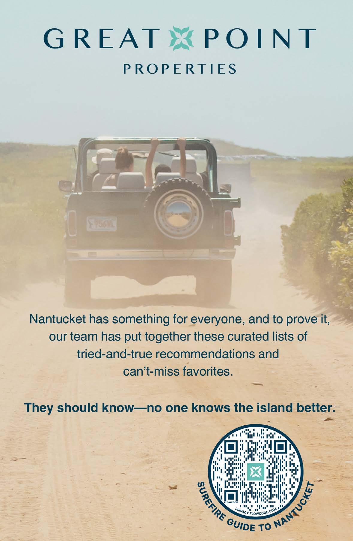 The Official Guide to Nantucket is published annually by the Nantucket Island Chamber of Commerce. ©2025 Nantucket Island Chamber of Commerce. All rights reserved. Reproduction of any part of this publication by any means without written permission from the publisher is prohibited. Requests for copies, inquiries for advertising, editorial, or photographic submissions should be directed to the Nantucket Island Chamber of Commerce, Zero Main Street • Nantucket, MA 02554 • 508-228-1700. In the event of any error or omission in this Guide, the Nantucket Island Chamber of Commerce (NICC) assumes no liability for losses resulting in, nor any obligation to correct, the error or omission. For paid listings, the liability is limited to the amount paid for the listing in which the error occurred, for the issue life of the Guide. The NICC assumes no responsibility for errors or omissions occurring either in non-paid listings, editorial content, or in paid camera-ready advertising submitted to the NICC.