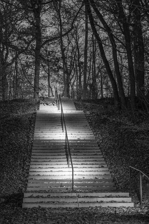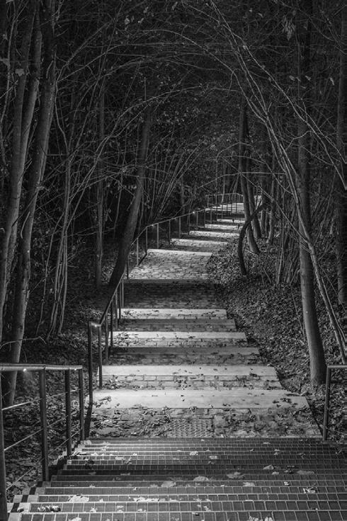 Au plus proche de la topographie, sans couper 1 seul arbre, les cheminement empruntent au vocabulaire de pavés de grès, plateformes métalliques franchissant les pentes les plus fortes et marches béton préfabriquées permettant une intervention respectueuse de cet environnement. Apportant un réel confort d'usage, ces liaisons évitent par là-même le piétinement préjudiciable aux arbres et à la qualité du sousbois et de son sol meuble et vivant.