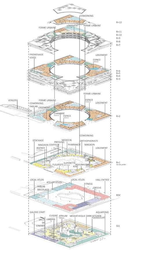 Des galerie d’art, salle de cinéma, cuisine, atrium, médiathèque, aquaponie, food court au Sous-sol.