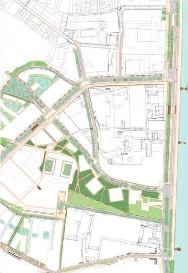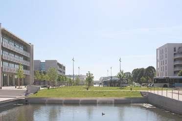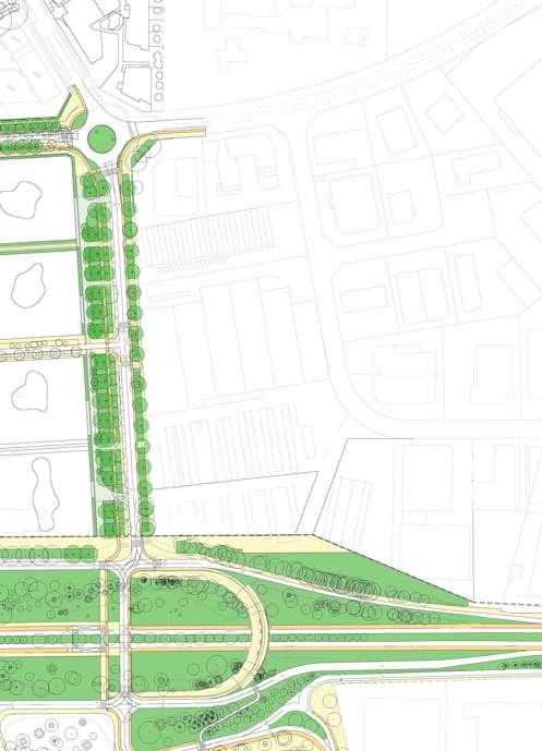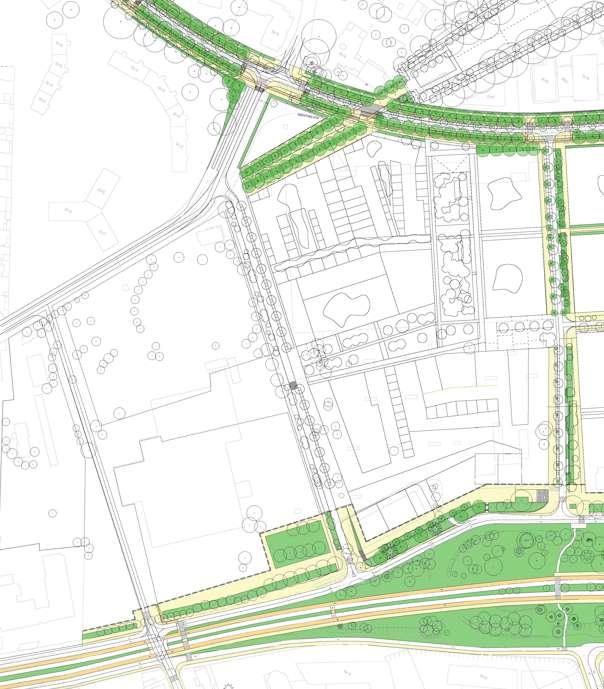 Les premières démarchent consistent à concevoir des espaces publics avec une attention particulière au confort urbain grace à la connexion végétale et piétonne pour en faire un parc central qui facilite la transition entre les îlots sud résidentiel et l'îlot nord commercial.