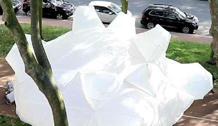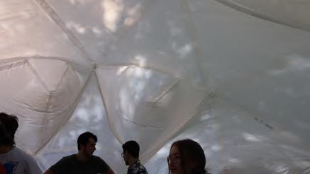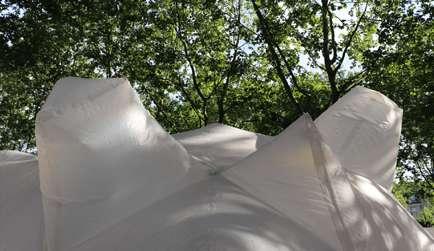 FR. Dans cette structure gonflable, la conception de patrons permet un assemblage propre des pièces plastiques. Certaines pièces du puzzle sont remplacées par des extrusions donnant cet aspect massif de l’extérieur mais étendu et aéré à l’intérieur.