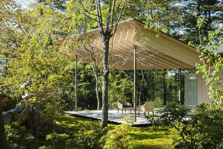 Le toit a une forme unique et relie le sol et la maison. Les matériaux utilisés sont principalement le bois, beaucoup utilisé par l’architecte Kengo Kuma et matériaux le plus répandu dans l’architecture japonaise, ainsi que la roche volcanique locale récoltée au Mont Fuji.